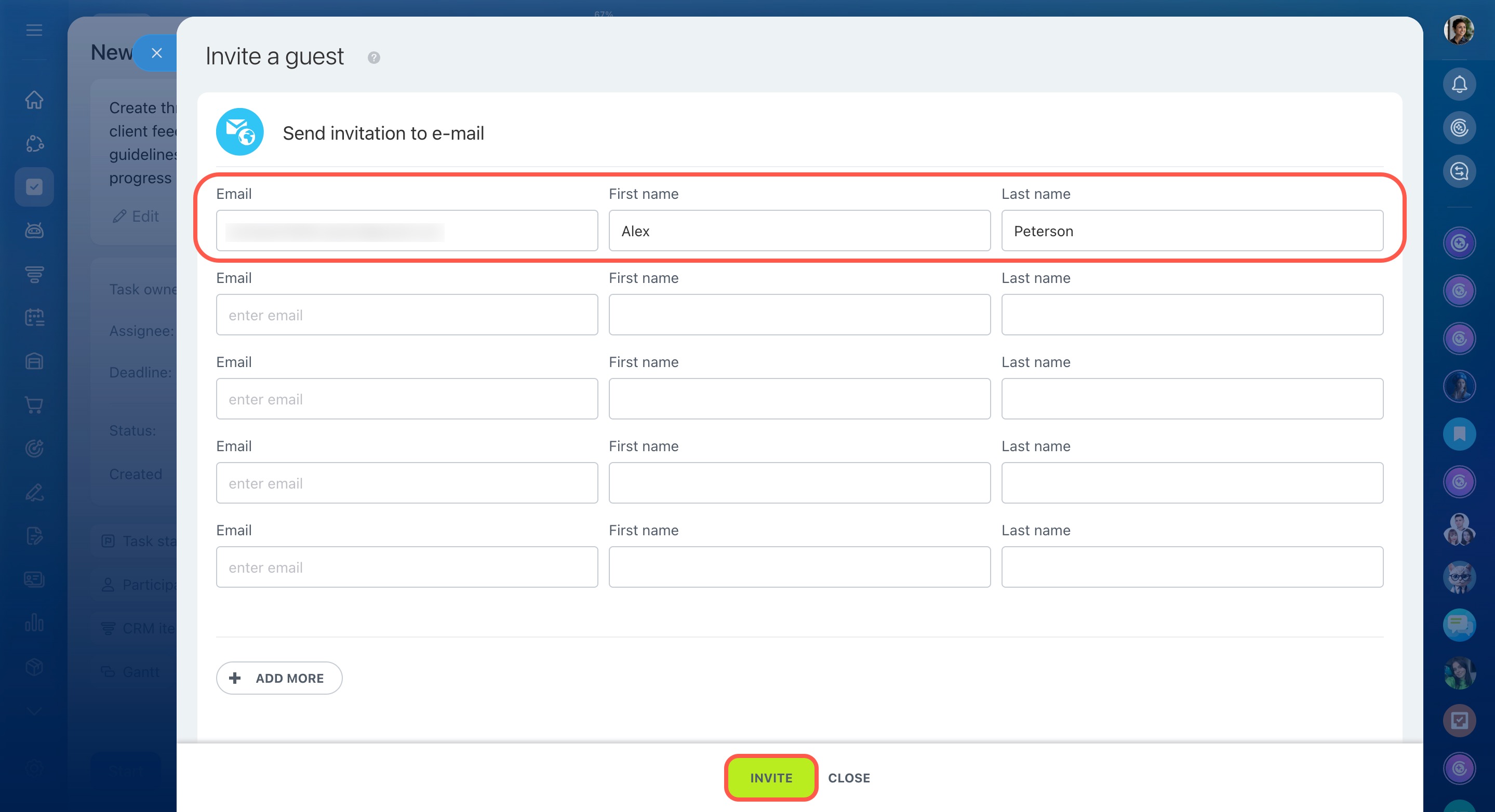 Un utilisateur externe peut être soit responsable de la tâche, soit participant ou observateur. Définissez son rôle et dans le champ requis cliquez sur Ajouter - Inviter une personne externe.