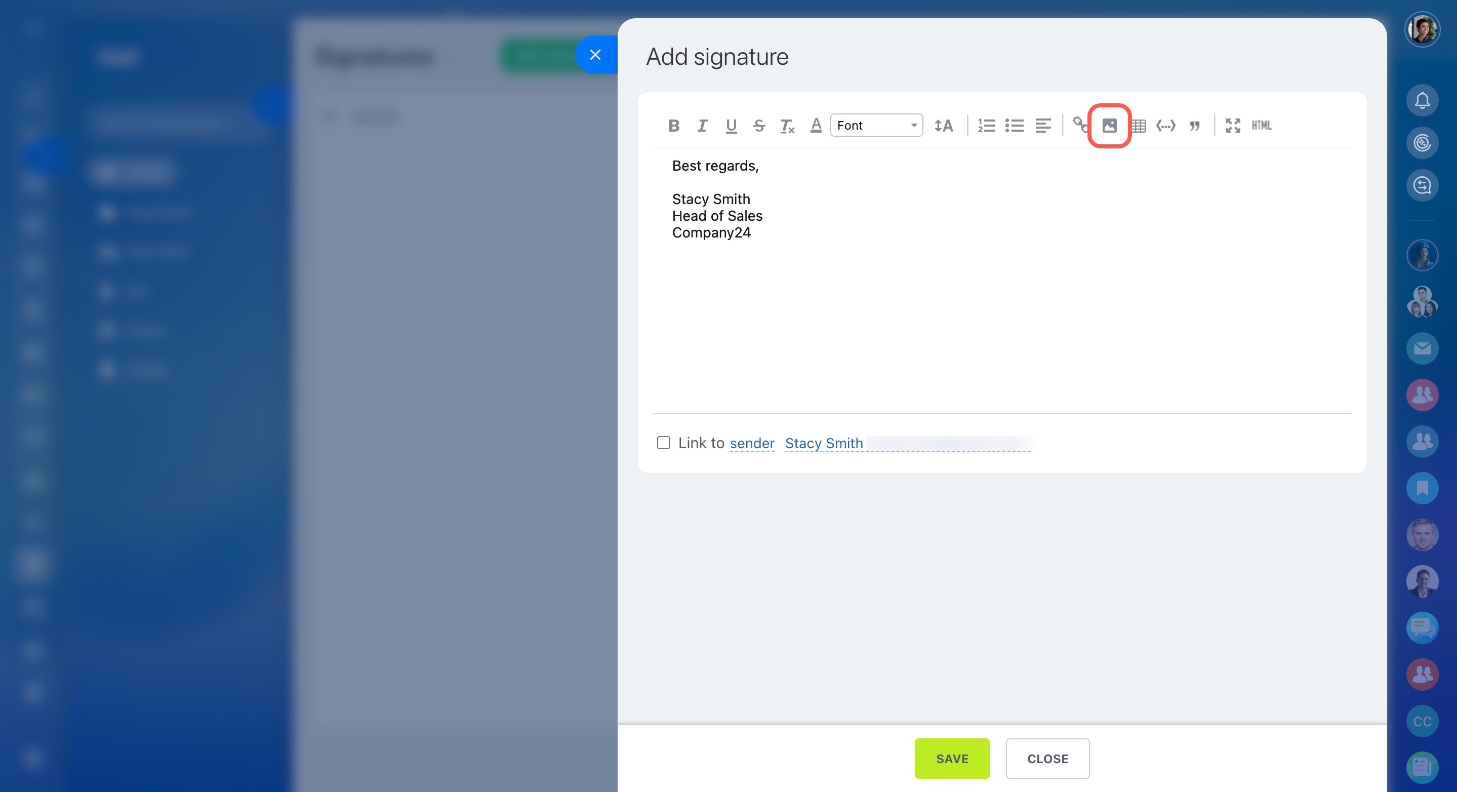 Pour ajouter une image à la signature, cliquez sur le bouton correspondant dans le menu.