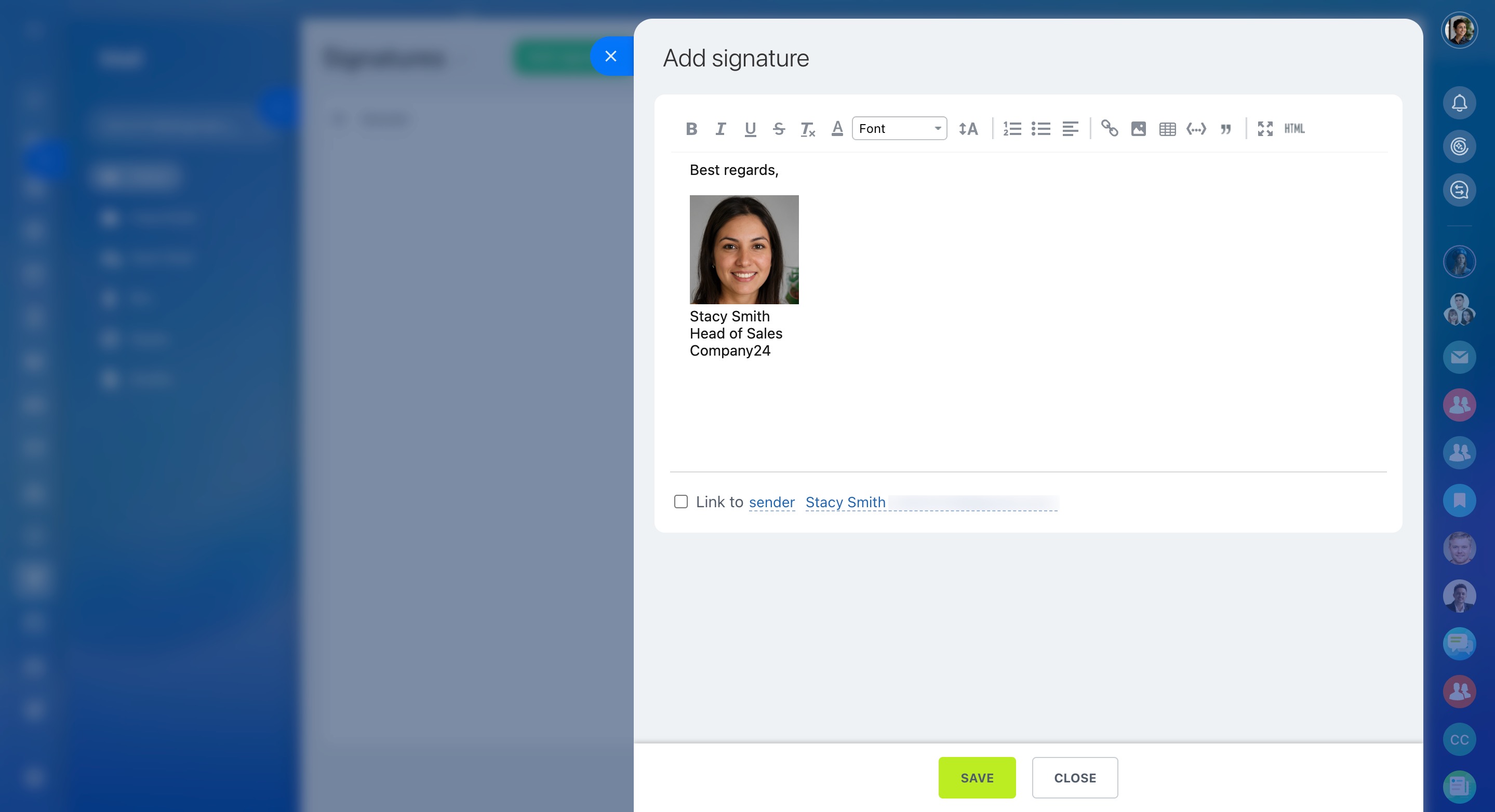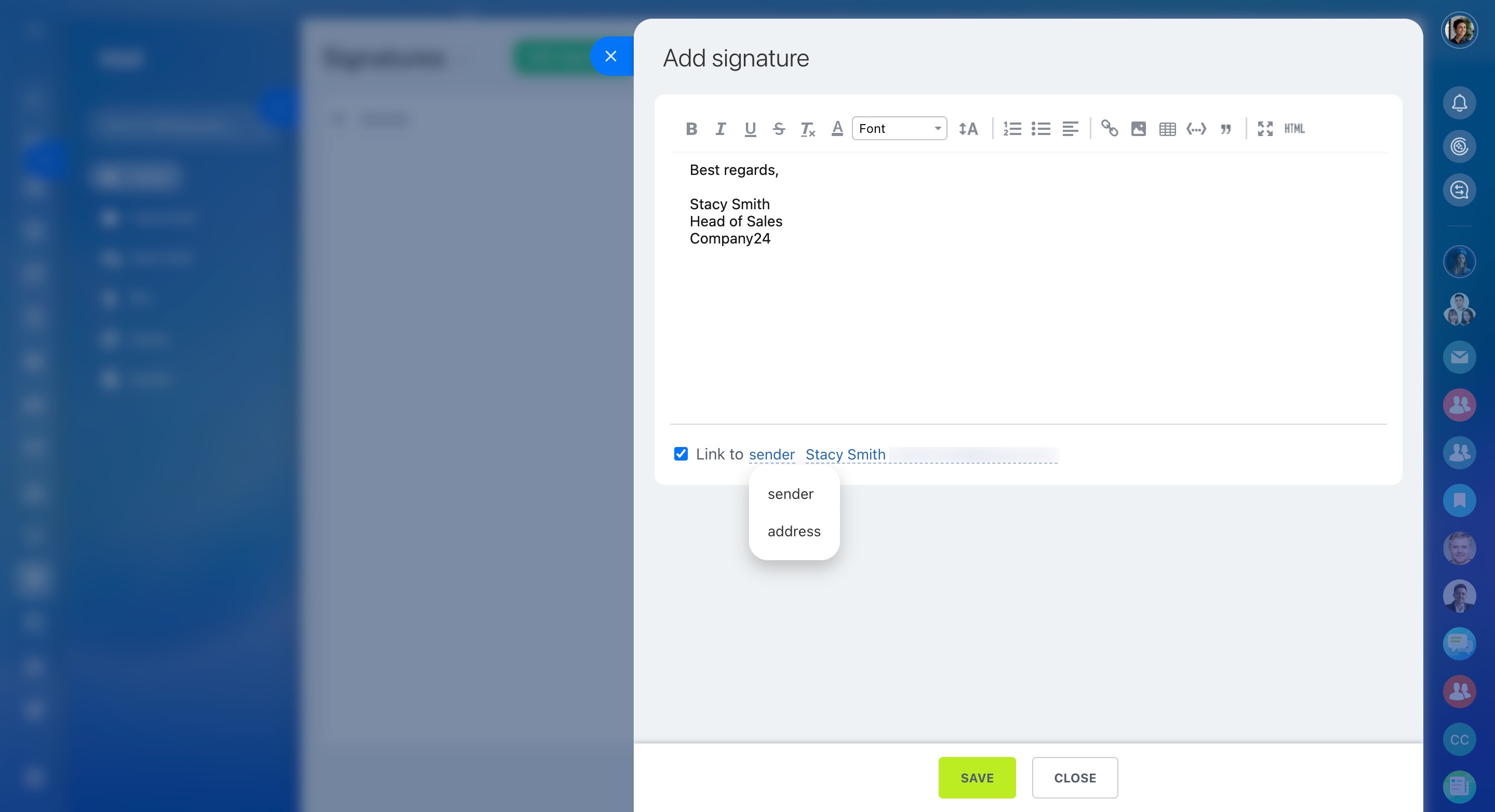 Créez une signature unique pour vos e-mails. Pour cela faire, cliquez sur le bouton approprié. Rédigez le texte qui sera indiqué dans la signature des e-mails sortants. Attachez-le à l'expéditeur ou à une adresse spécifique si vous en avez plusieurs.