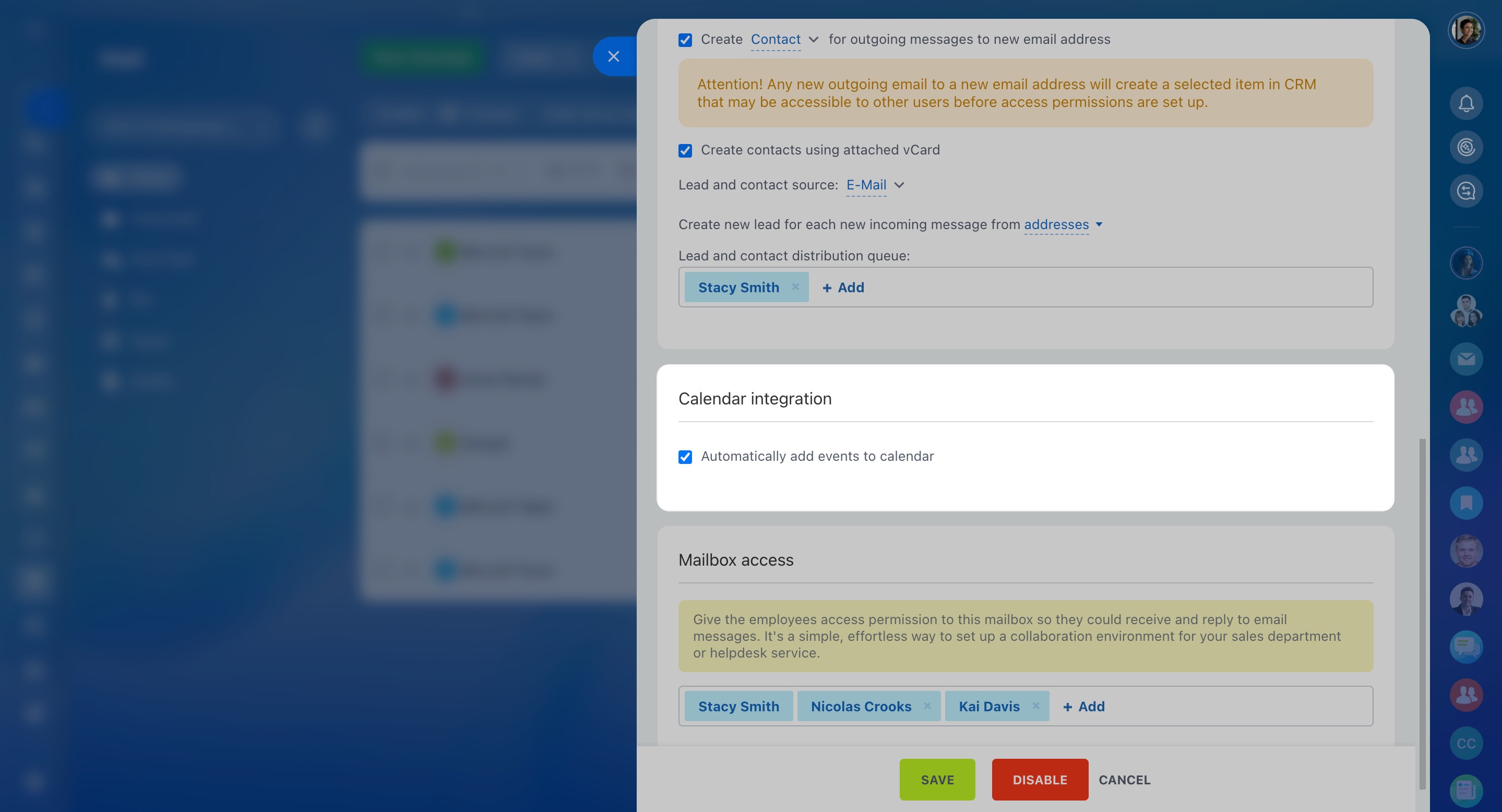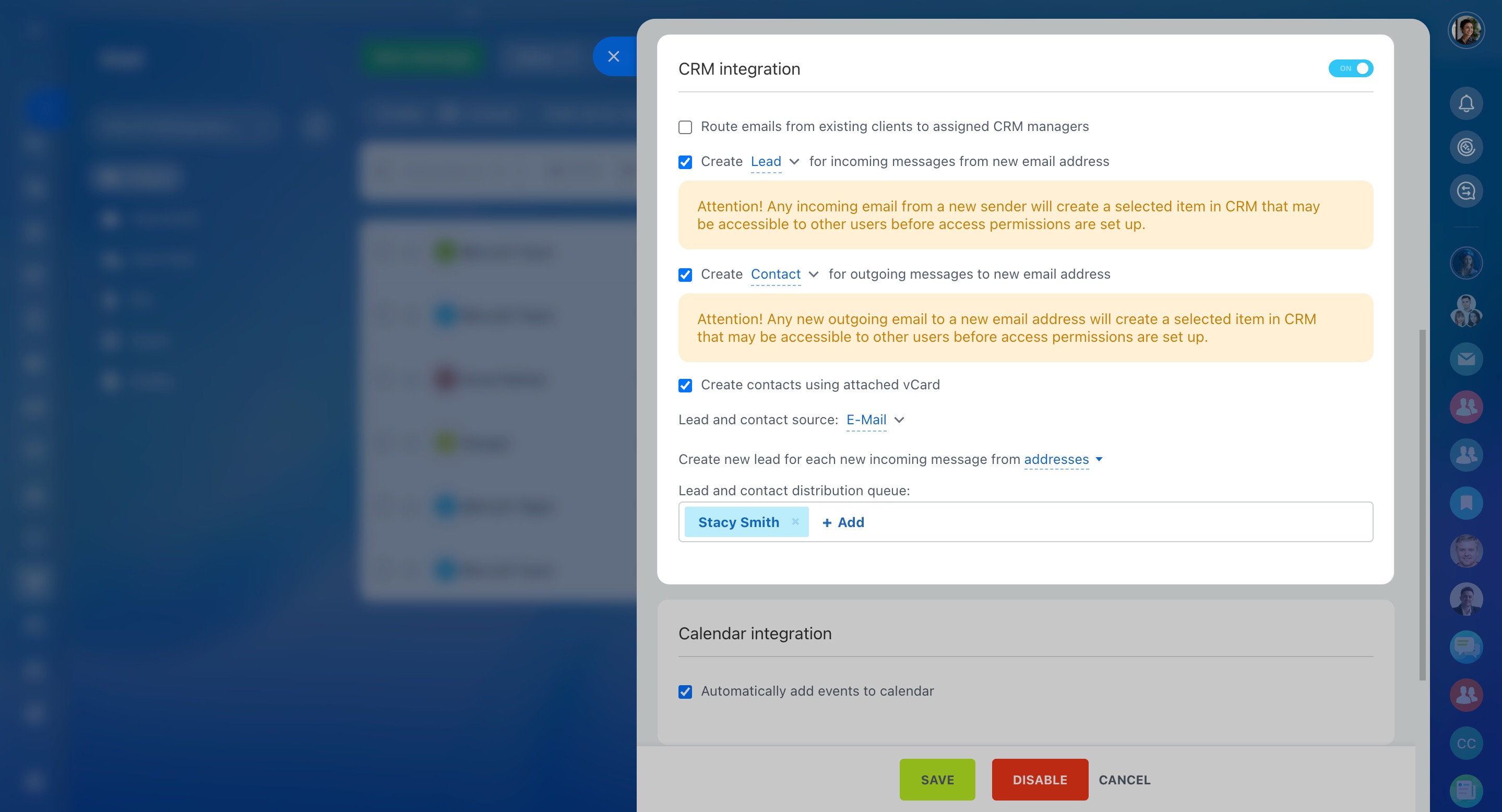 Dans les paramètres de messagerie, vous pouvez activer l'intégration avec le calendrier. Cochez la case pour ajouter automatiquement l'événement au calendrier Bitrix24.