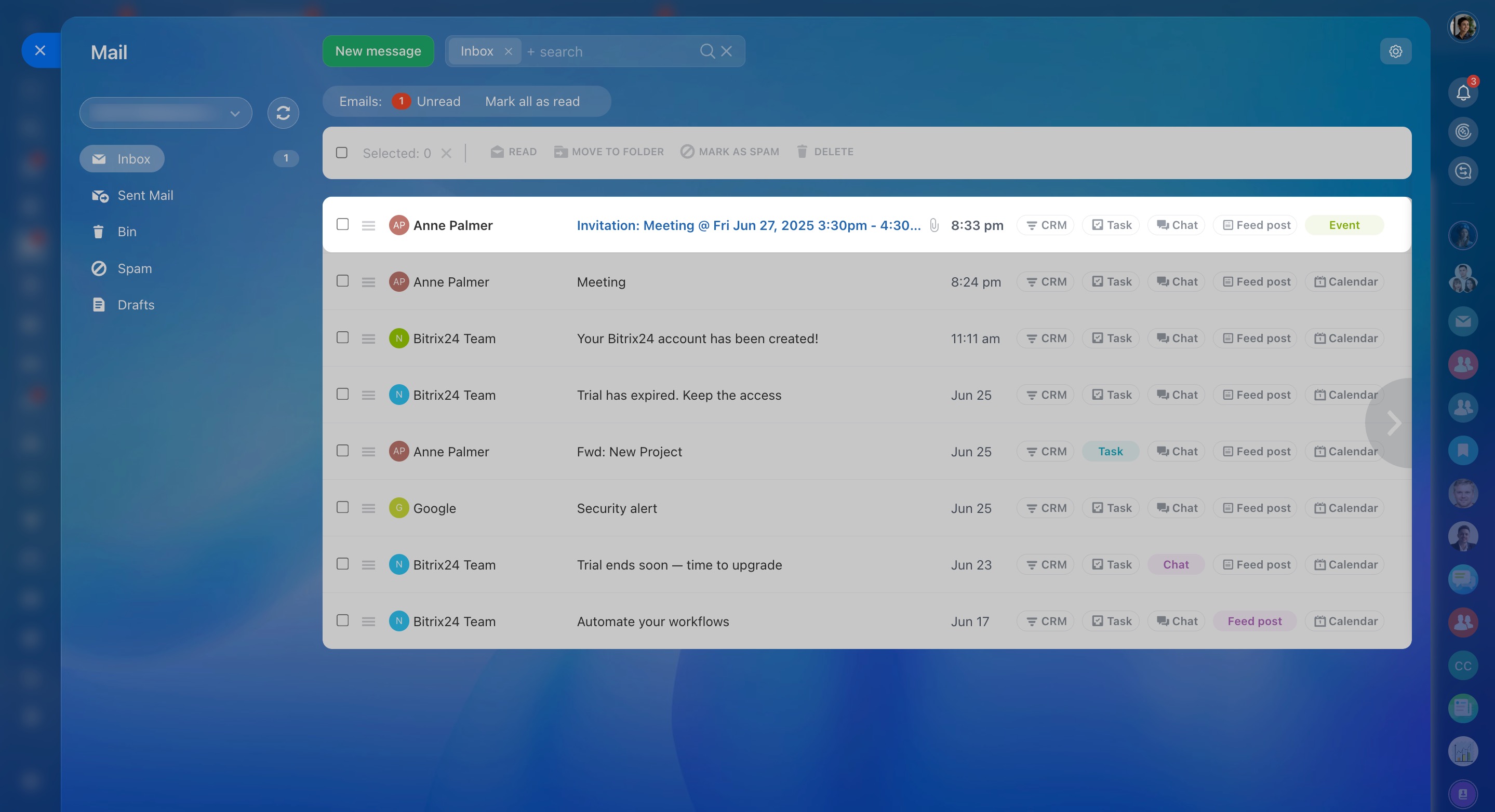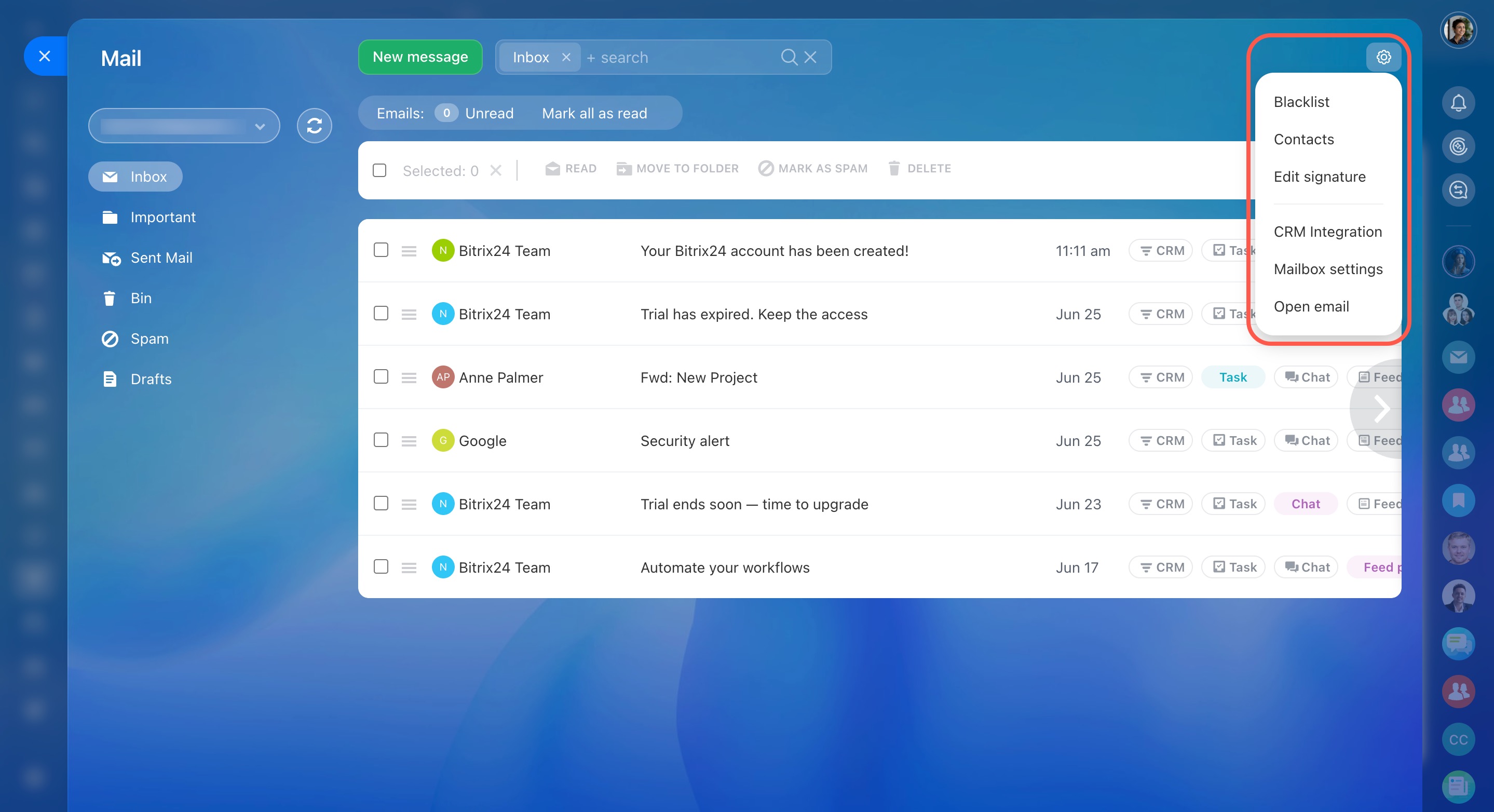 - Dans la messagerie web Bitrix24, vous pouvez configurer une liste noire, un carnet d'adresses, une signature et une intégration avec le CRM.
