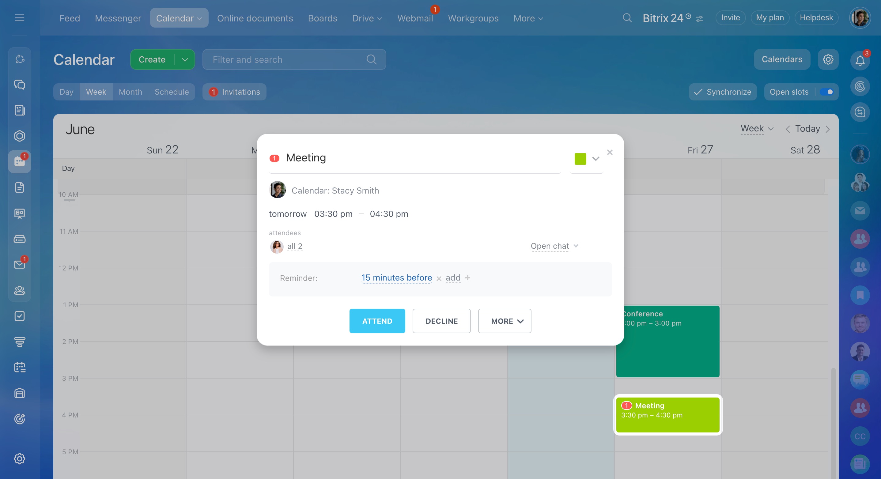Par exemple, une invitation à une réunion sur Google Meet ou un autre service d'appels externe est reçue dans l'adresse e-mail liée à Bitrix24. En même temps que la réception de l'e-mail, un événement est créé dans le calendrier Bitrix24. Vous pourrez choisir d'accepter ou de refuser l'invitation.