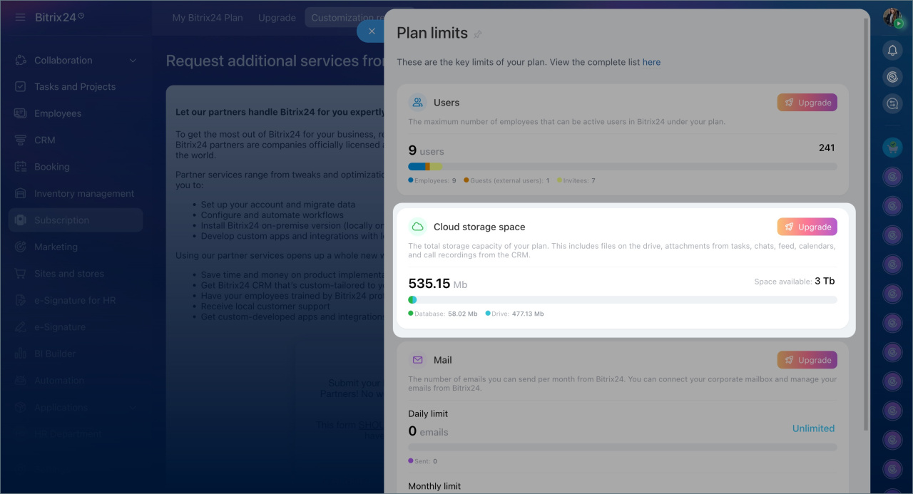 - Pour voir les informations sur l'espace occupé et libre dans Bitrix24, accédez à la section Abonnement et cliquez sur le nom de votre plan > Voir les limites > Espace de stockage cloud.