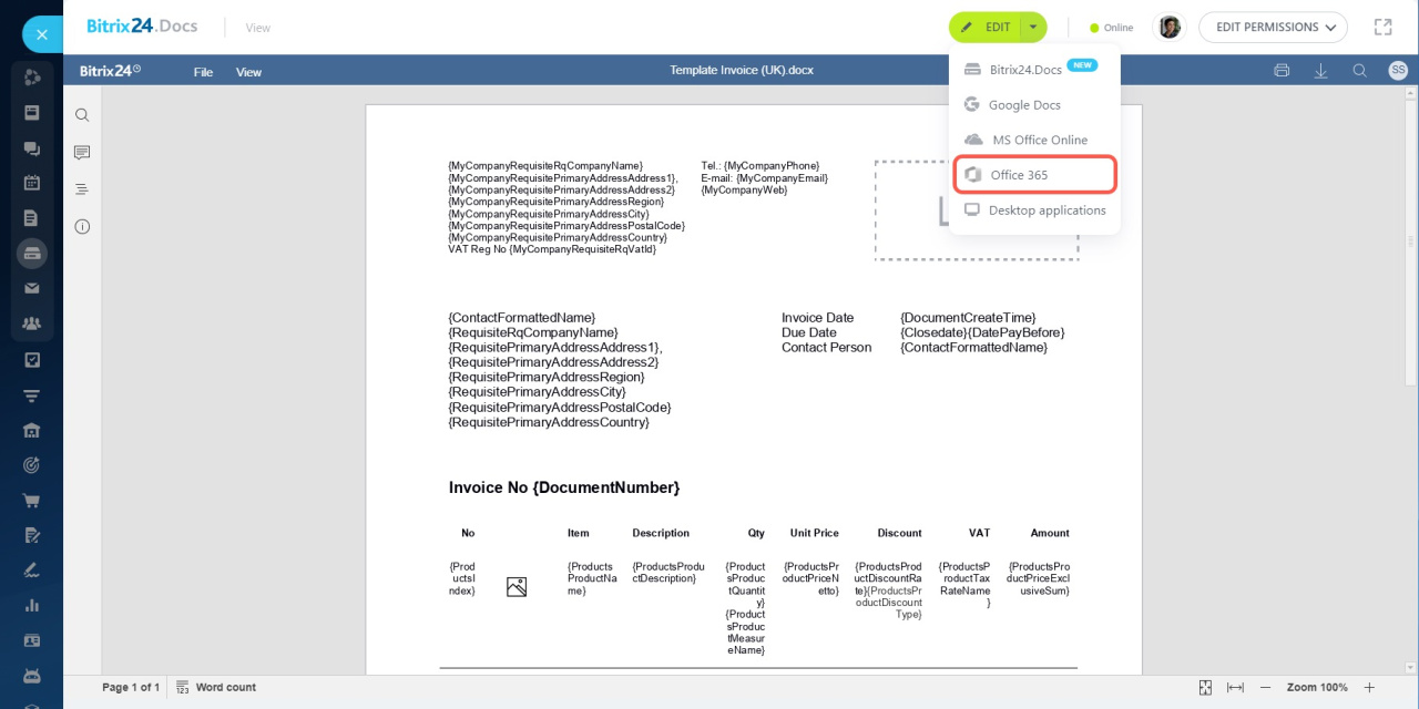 Si vous avez un compte personnel avec l'abonnement Office 365 pour les particuliers et que vous voulez éditer les documents dans le cloud, sélectionnez Éditer dans MS Office Online.