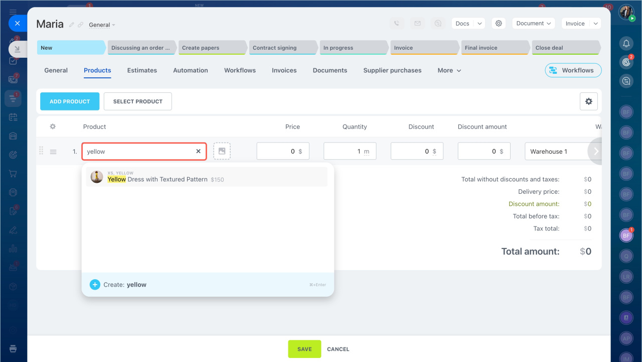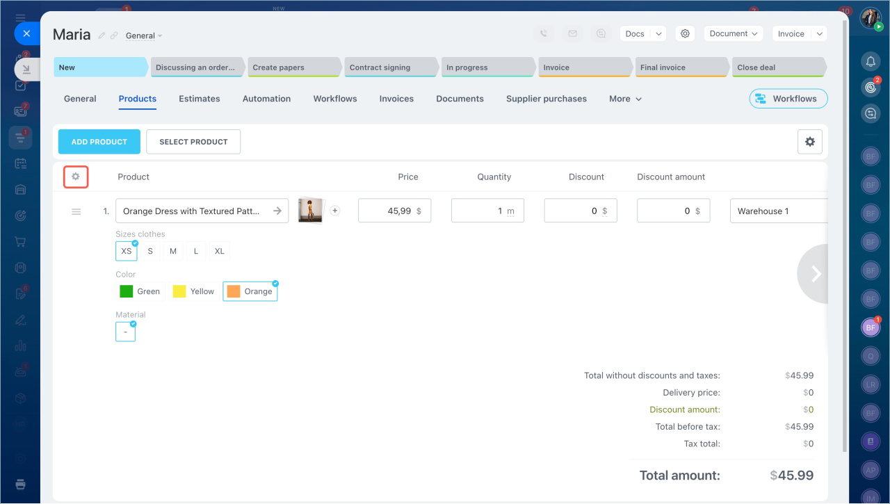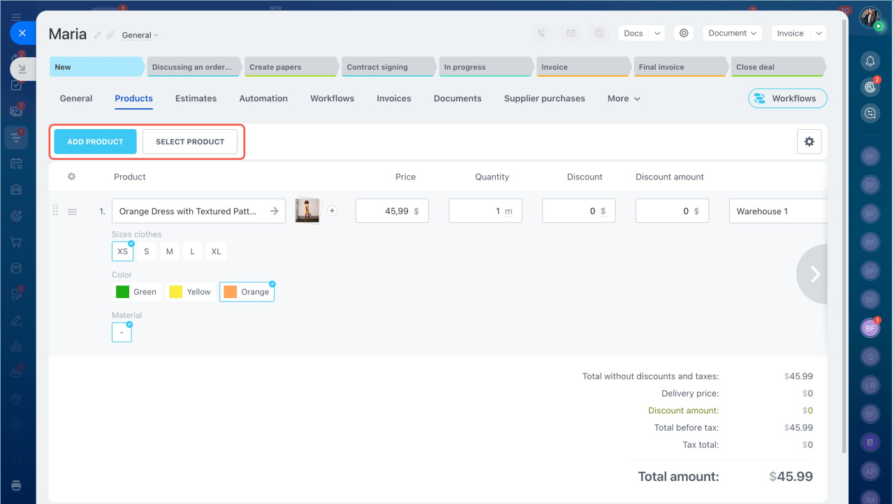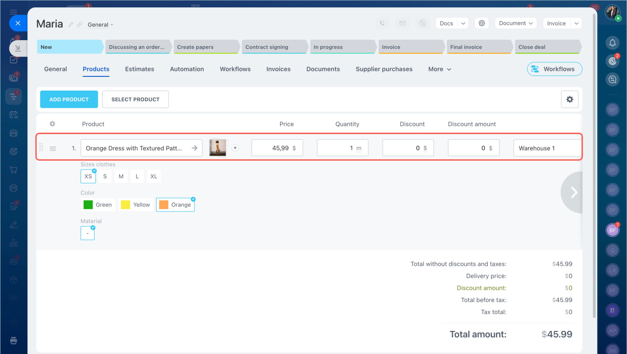 Vous pouvez sélectionner des produits dans les prospects, les transactions, les devis et les factures. Cela vous aidera à ne pas oublier ce que le client a choisi exactement, à calculer correctement le coût de la transaction, puis à collecter des données analytiques sur les produits.