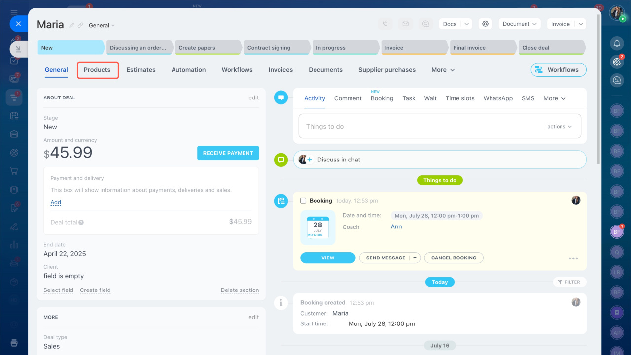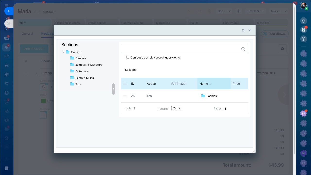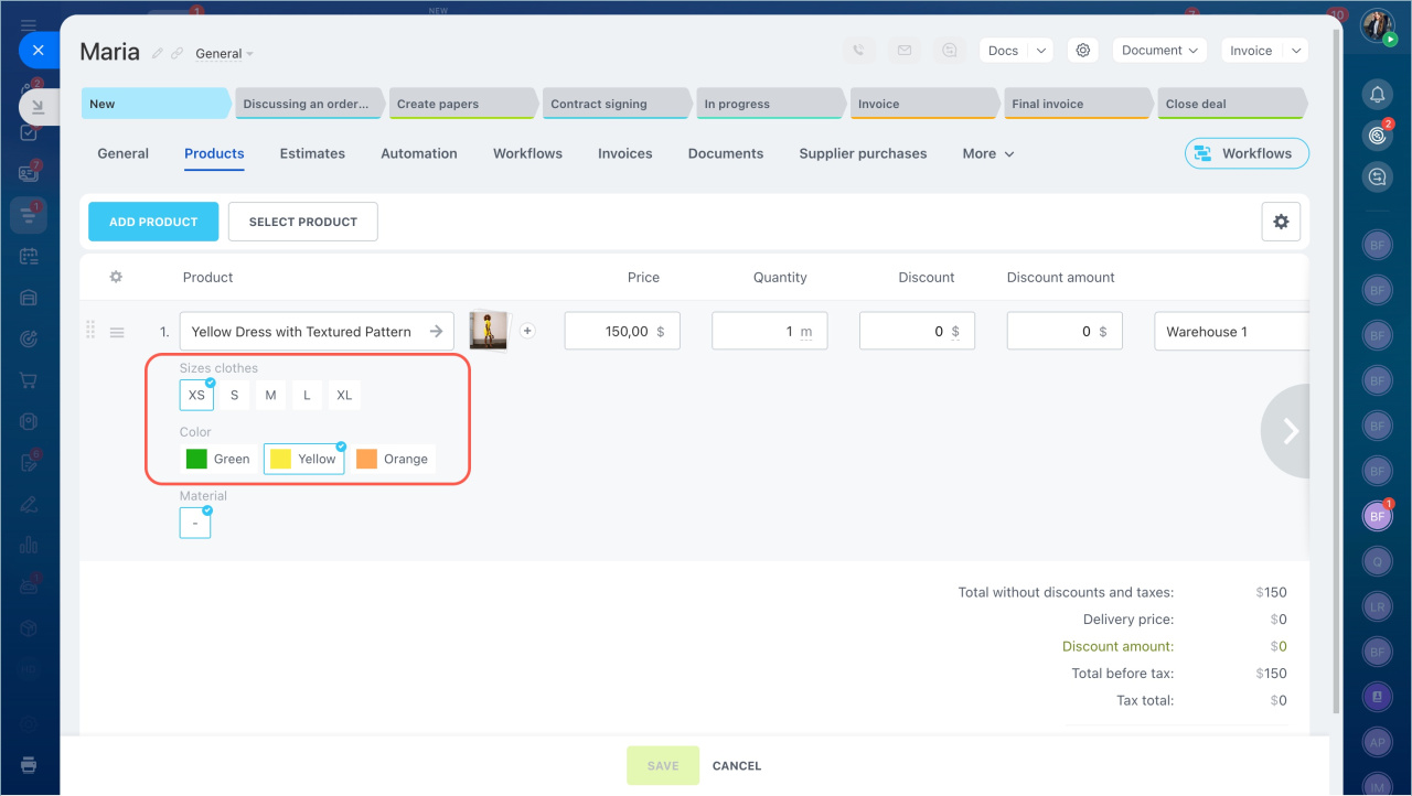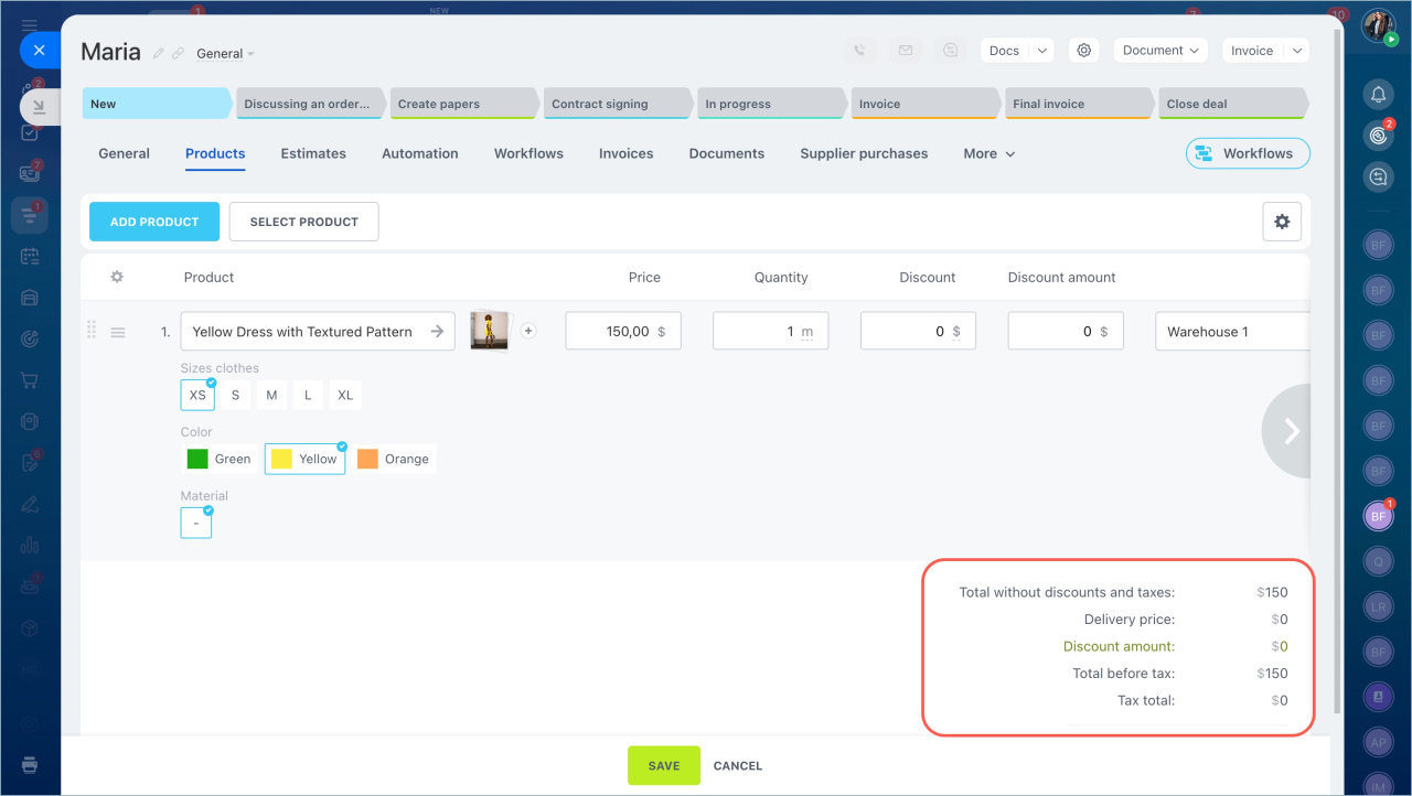 Vous pouvez sélectionner des produits dans les prospects, les transactions, les devis et les factures. Cela vous aidera à ne pas oublier ce que le client a choisi exactement, à calculer correctement le coût de la transaction, puis à collecter des données analytiques sur les produits.