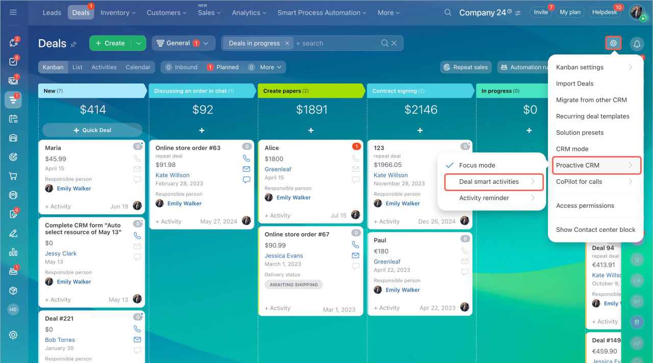 Dans la section de l'élément. Dans les paramètres (⚙️), cliquez sur CRM proactif - Activités intelligentes sur la transaction et sélectionnez l'option souhaitée.