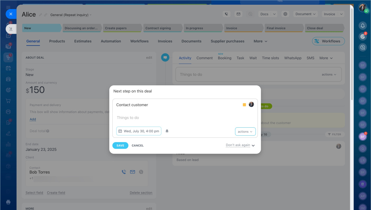 - Par défaut, l'activité Intelligente est déjà remplie : vous verrez le texte « Contacter le client ». La date limite est fixée automatiquement - trois jours ouvrables.
