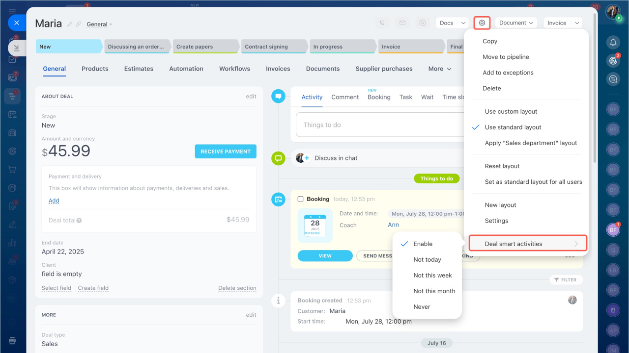 Dans le formulaire d'élément. Ouvrez une transaction ou un prospect, dans les paramètres (⚙️), cliquez sur Activités intelligentes sur la transaction et sélectionnez l'une des options pour les activités intelligentes.