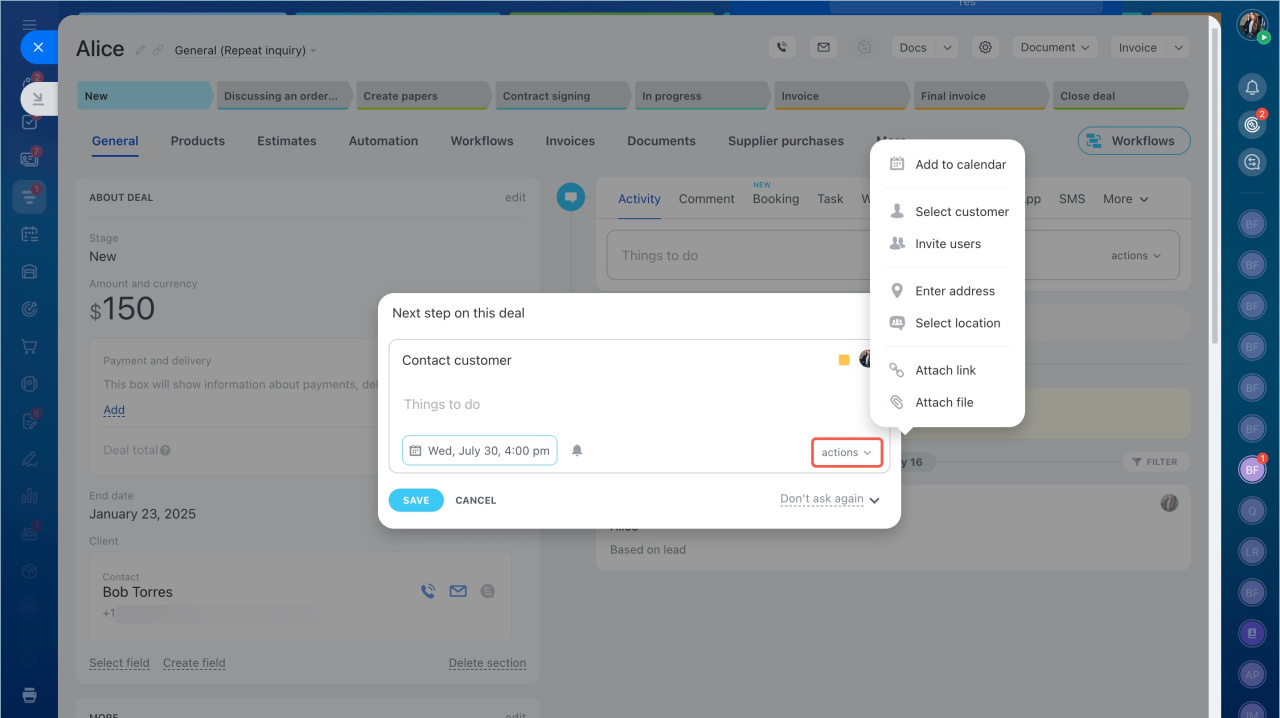 Cliquez sur Enregistrer et l'activité apparaîtra dans la chronologie de la transaction. Vous pouvez annuler la création d'une activité en appuyant sur le bouton correspondant ou sur la touche Echap.