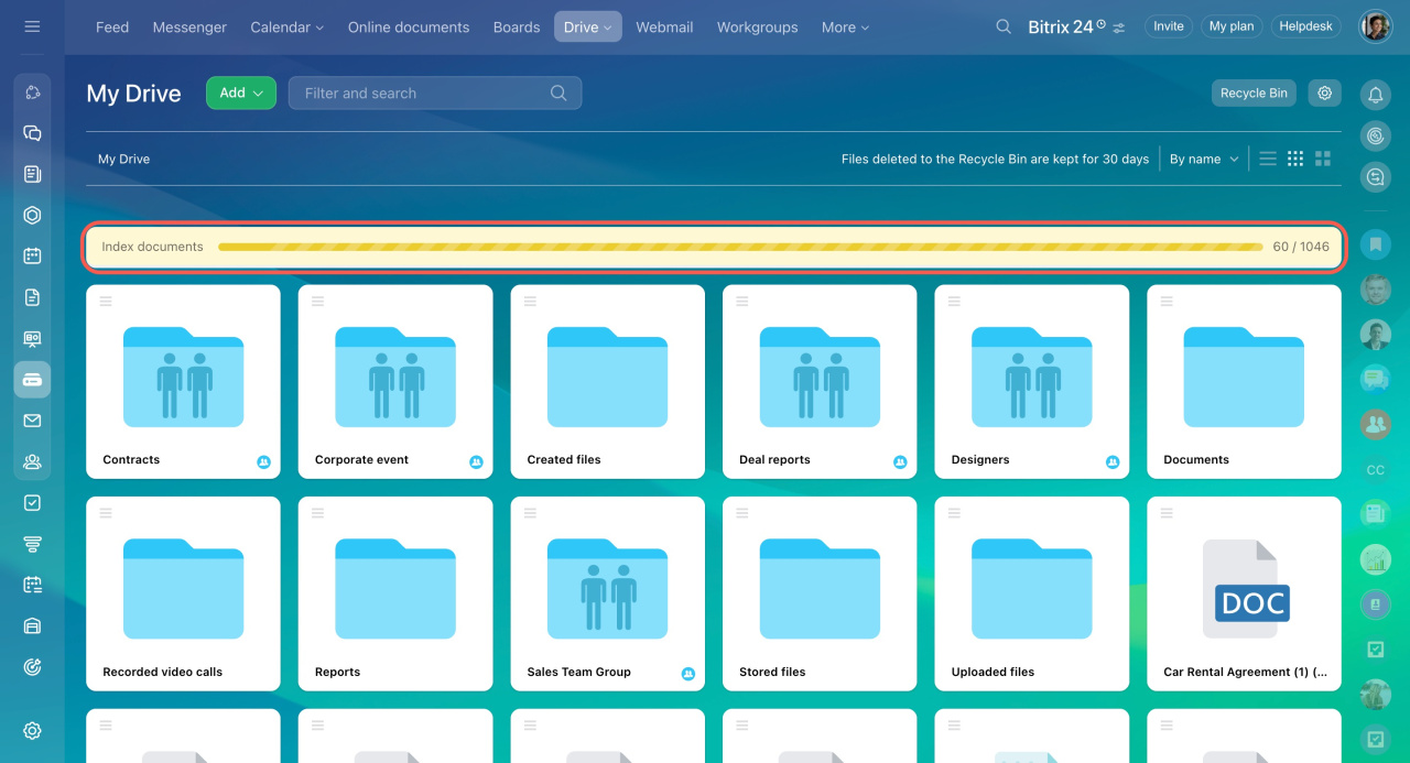 Après avoir activé l'option Rechercher le contenu des documents, Bitrix24 commence à indexer les documents sur les disques. Cela se produira jusqu'à ce que tous les documents soient indexés pour la recherche. Une fois le processus terminé, la recherche fonctionnera.