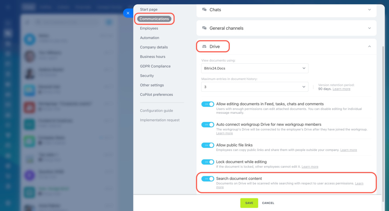 Accédez à la section Paramètres - Communications - Drive et activez l’option Rechercher le contenu des documents. Cliquez sur Enregistrer.