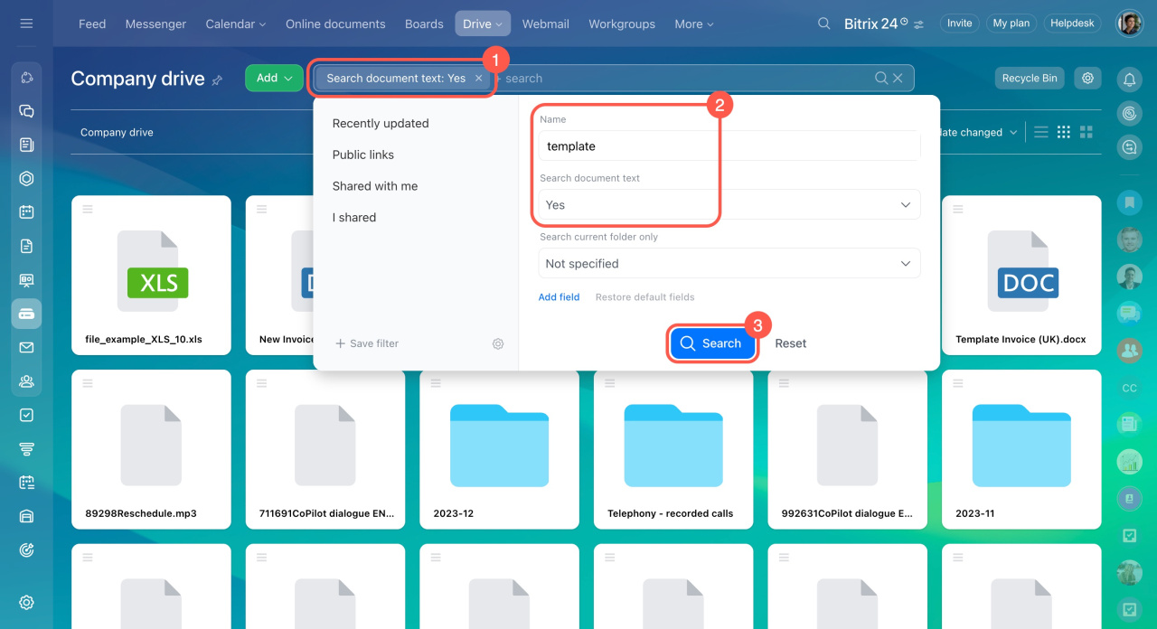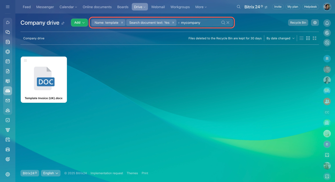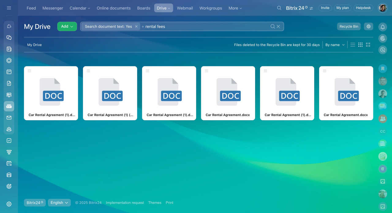 Saisissez une requête dans la barre de recherche, par exemple le nom de la contrepartie. Bitrix24 trouvera tous les fichiers qui le contiennent. Il peut s'agir de documents, de tableaux et de présentations aux formats .docx, .doc, .xlsx, .xls, .pptx, .ppt.