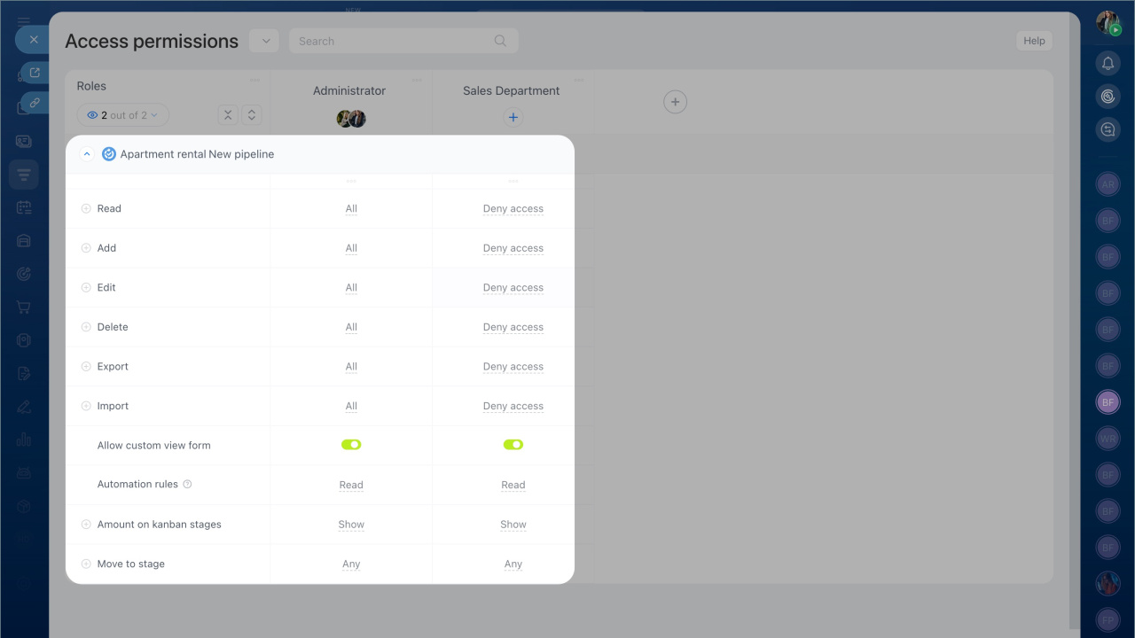 - Pour chaque processus, vous pouvez configurer un formulaire avec son propre ensemble de champs, des pipelines individuels, des étapes dans Kanban, des droits d'accès, une liaison avec des tâches, un calendrier et d'autres éléments.