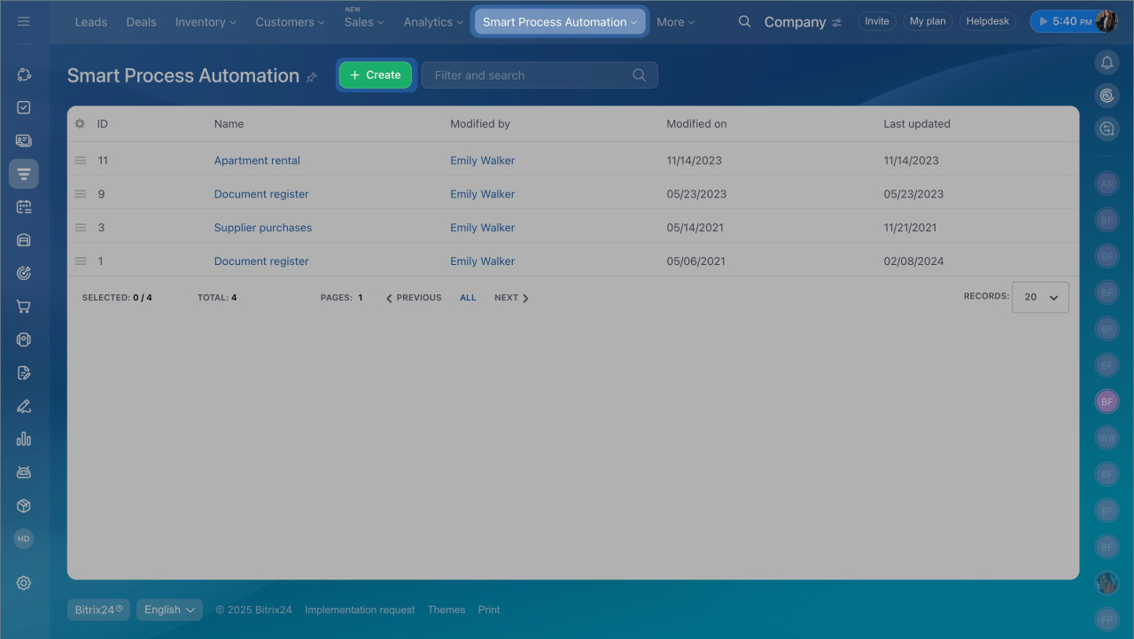 Les processus intelligents sont un outil qui vous permet de créer de nouveaux éléments CRM et de les personnaliser en fonction de vos besoins. Pour chaque processus, vous pouvez configurer un formulaire avec son propre ensemble de champs, des pipelines individuels, des étapes dans Kanban, des droits d'accès, une liaison avec des tâches, un calendrier et d'autres éléments.
