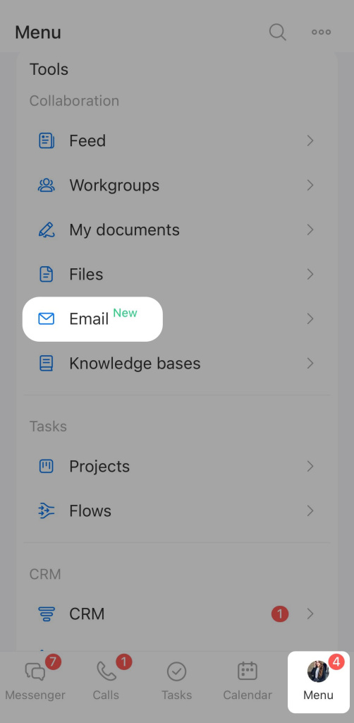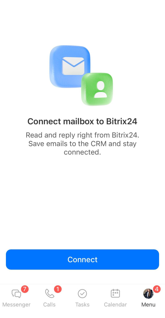 - Vous pouvez désormais connecter des boîtes de réception dans le CRM mobile. Cela peut être fait dans n'importe quel formulaire CRM contenant de la messagerie web : transactions, prospects, contacts, entreprises, factures, devis.