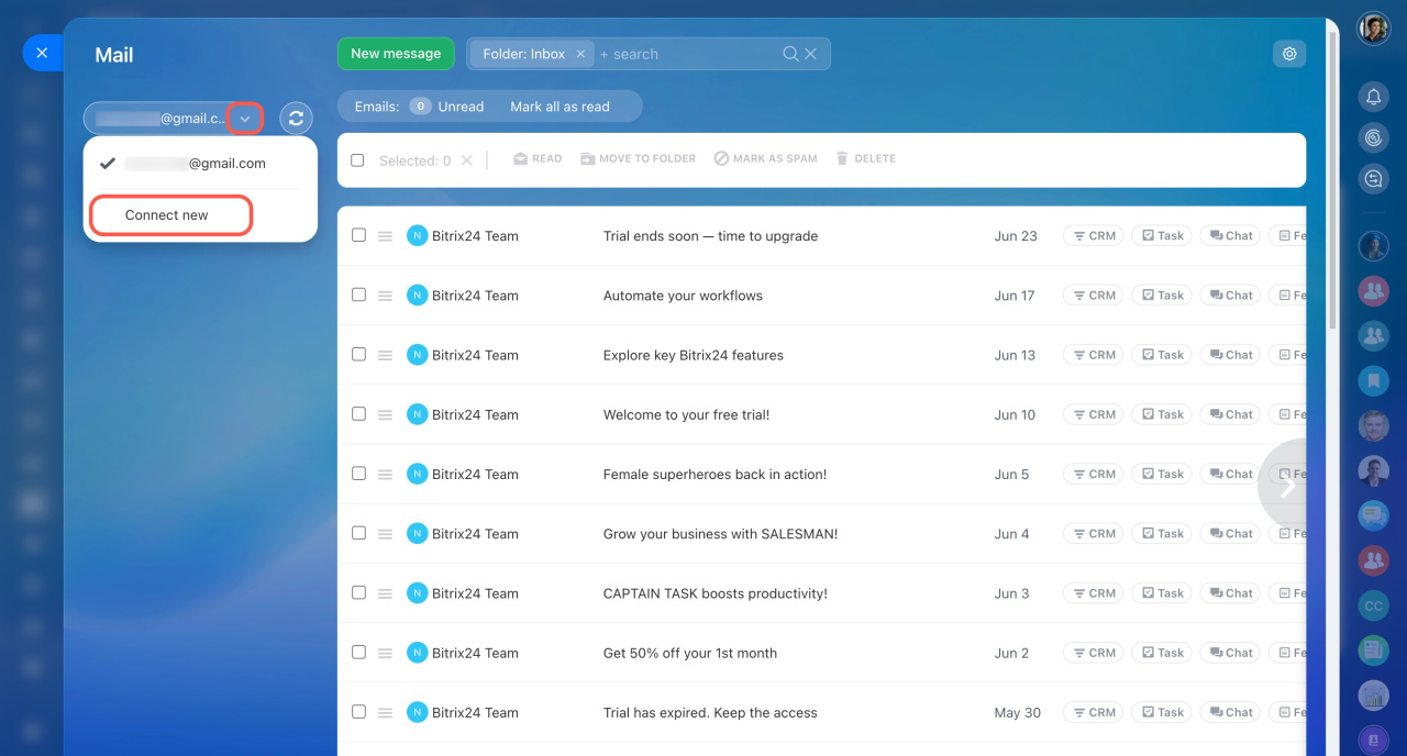Après cela, la boîte de réception sera connectée à la messagerie web dans Bitrix24.
