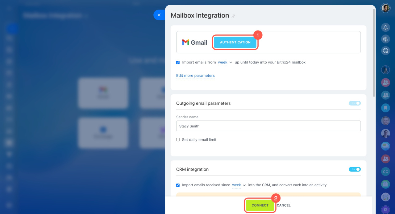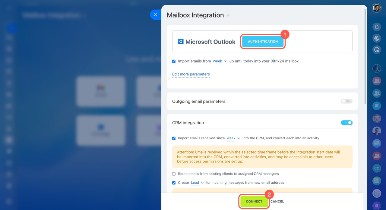 - Dans Bitrix24, il existe plusieurs façons de connecter la messagerie web. Ajoutez des boîtes de réception Gmail, Outlook, iCloud, Office 365, Exchange, Yahoo, Aol ou la messagerie professionnelle.
