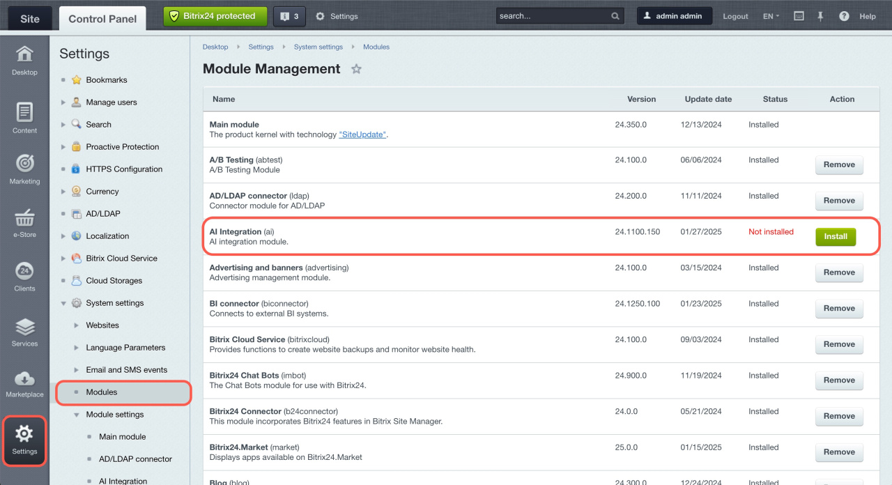 Mettre à jour la version On-Premise de Bitrix24 - Allez dans Settings - Modules et installez le module AI Integration.
