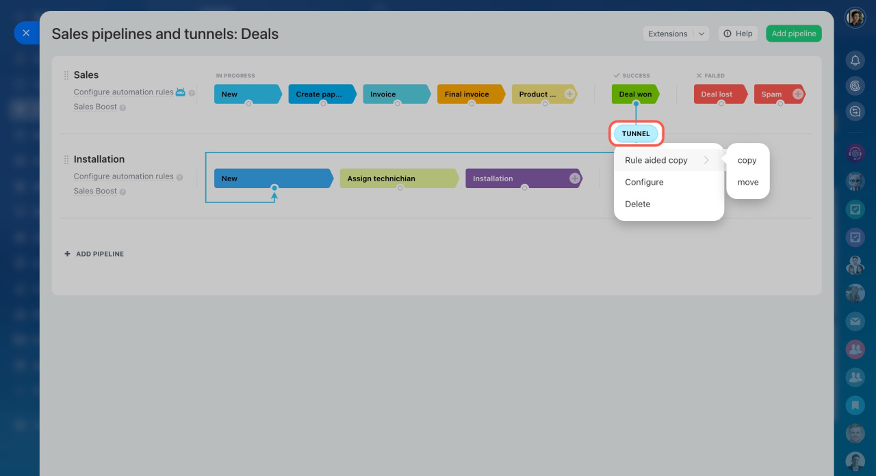 - Les tunnels de ventes sont un outil pour relier les pipelines de vente entre eux. Les tunnels sont nécessaires lorsque le processus de travail consiste en un grand nombre d'étapes. Les tunnels aideront à relier plusieurs pipelines, et à une certaine étape de copier ou de transférer la transaction de l'une à l'autre.