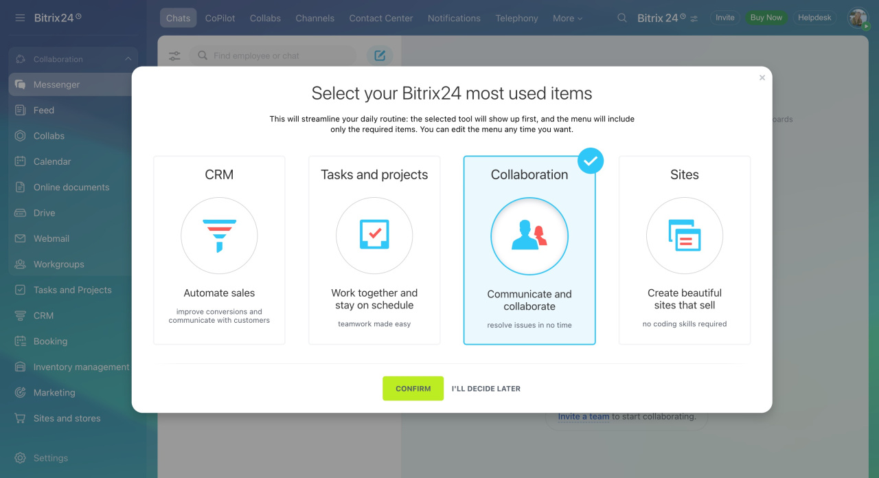 Choisissez les outils Bitrix24 avec lesquels les employés travailleront le plus souvent. Pour discuter des questions de travail dans les chats et planifier des réunions dans le calendrier, cliquez sur Collaboration - Confirmer.