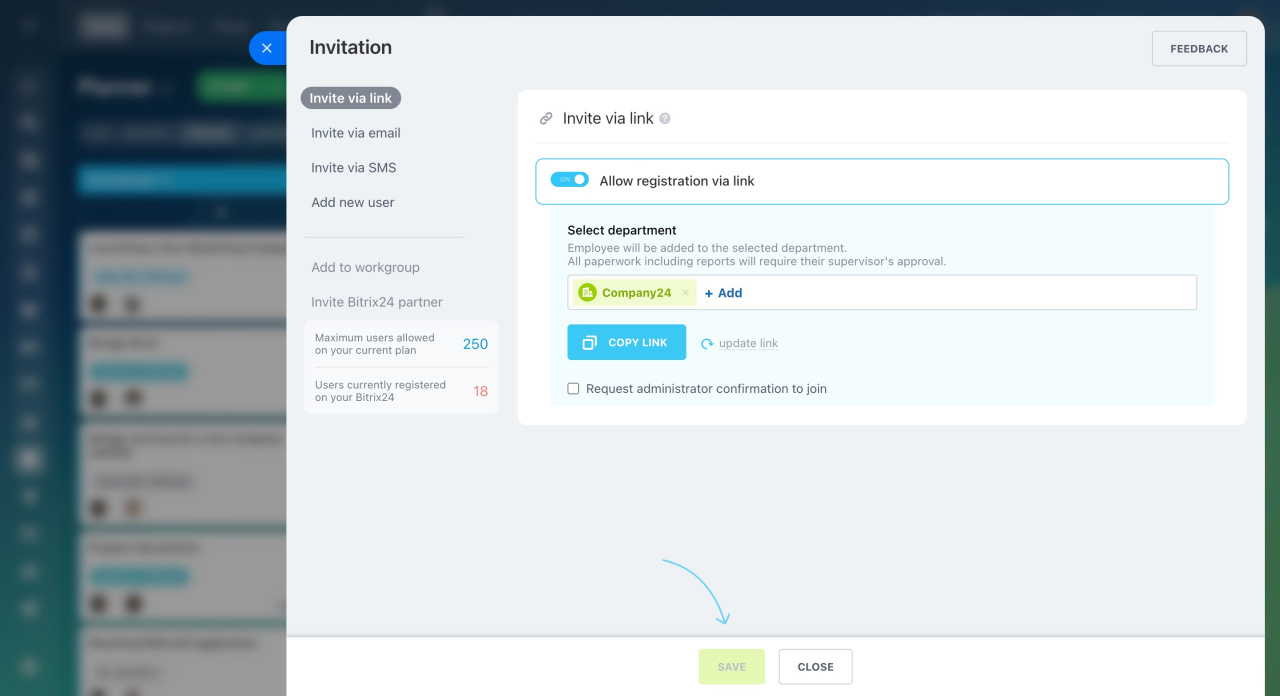 - Inviter à rejoindre un service ou un groupe de travail - utilisez cette option lorsque vous créez des départements et des groupes dans Bitrix24.