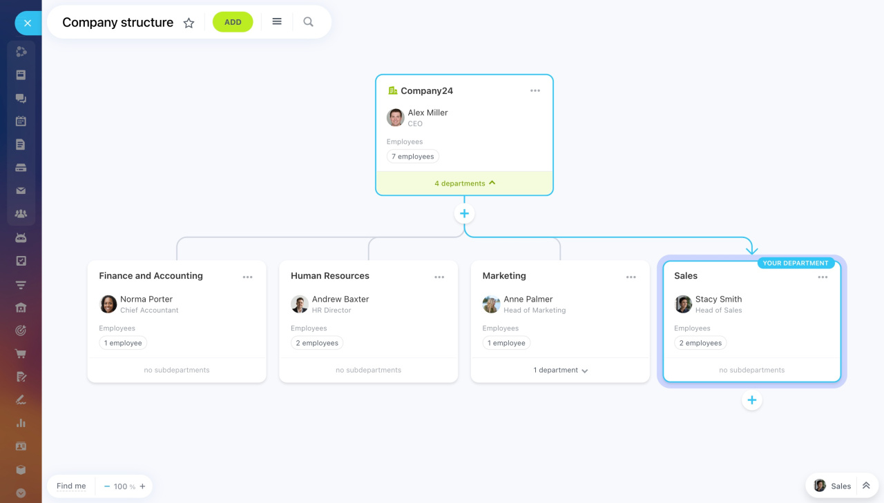 Structure de l'entreprise est un schéma qui montre comment l'entreprise est structurée : quels sont les départements, leurs employés et leurs dirigeants. La structure de l'entreprise affecte les droits d'accès à certains outils Bitrix24. Par exemple, les superviseurs voient les rapports de travail et les tâches de leurs subordonnés, tandis que les employés ordinaires ne voient que les leurs.