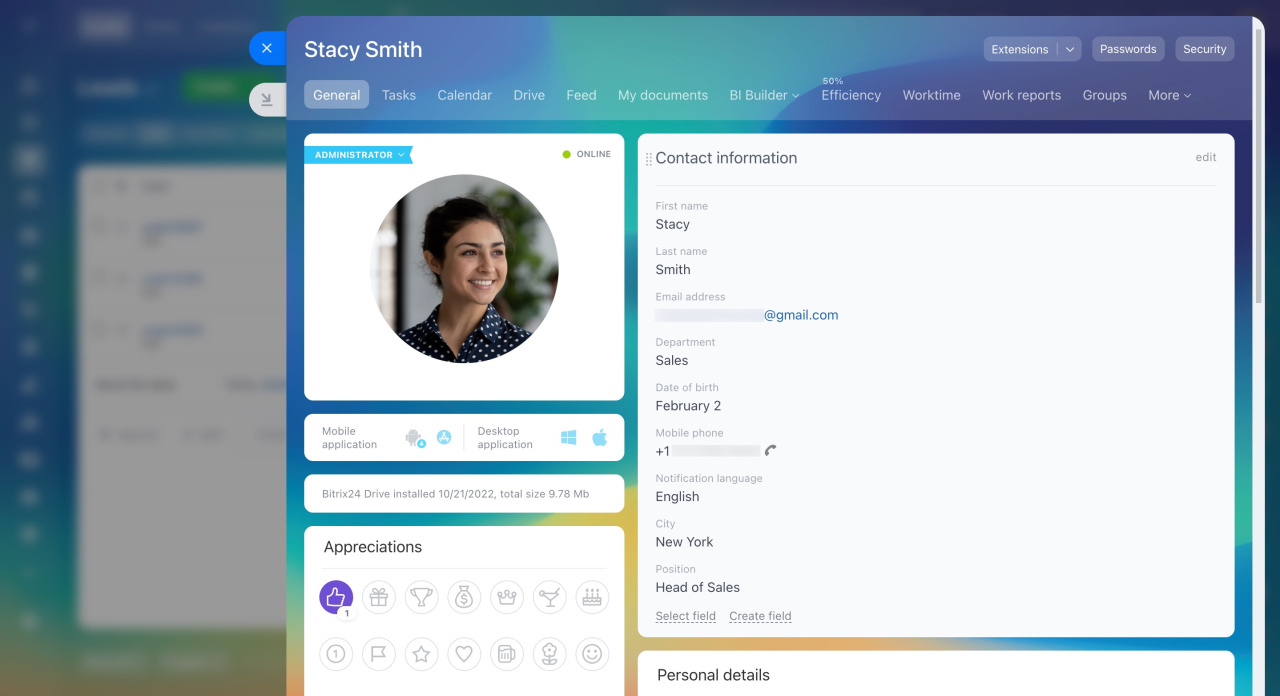 Chaque utilisateur de Bitrix24 dispose d'une page contenant des informations personnelles. Pour permettre à vos collègues d'en savoir plus sur vous, ajoutez une photo, des coordonnées à votre profil et parlez de vos loisirs.
