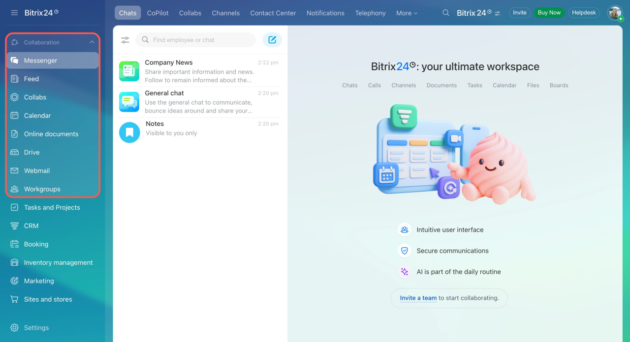 Bitrix24 est un service en ligne qui contient des outils utiles pour toute l'entreprise : chats et appels, tâches et projets, CRM, Assistant IA.