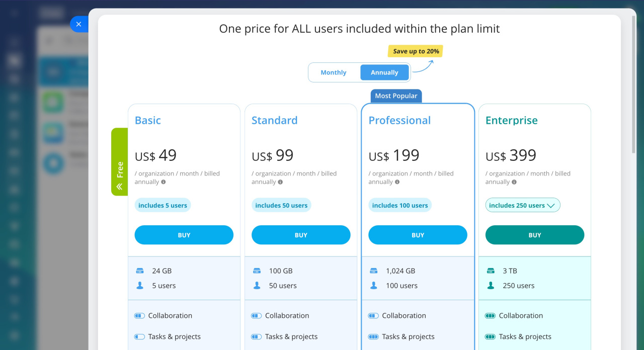Bitrix24 propose cinq tarifs : Free, Basic, Standard, Professional, Enterprise. Choisissez un plan en fonction des besoins de votre entreprise, de la taille de votre équipe et des outils dont vous avez besoin.