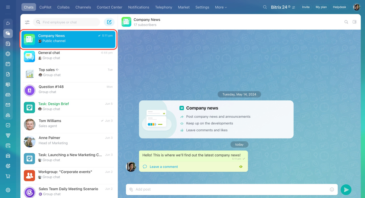 Dans la mise à jour de printemps, nous avons publié une nouveauté - Bitrix24 Chaînes. Utilisez-les pour informer, partager des expériences et rassembler des intérêts au sein d'un département ou d'une entreprise entière. Les chaînes sont accessibles à tous les employés.