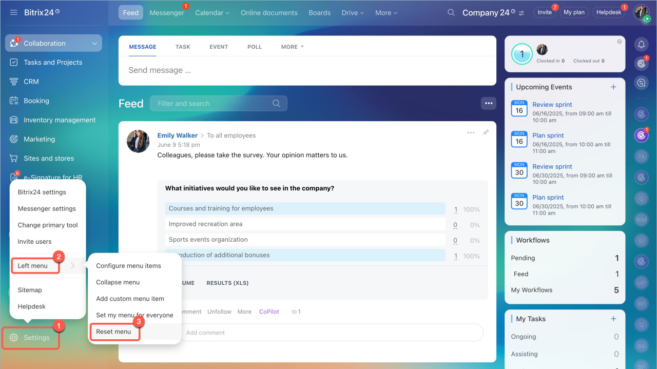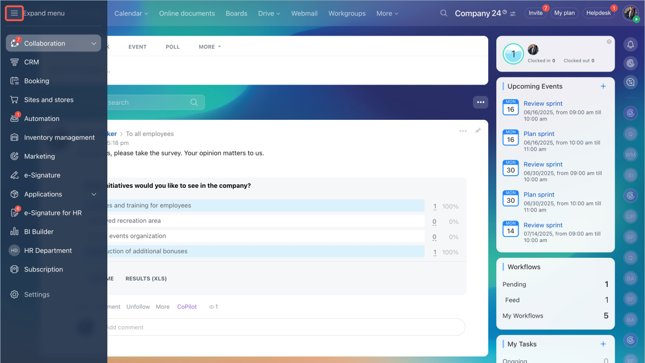 - L'ordre des éléments de menu dépend de l'outil principal Bitrix24. Par défaut, la section Collaboration est sélectionnée. Vous pouvez modifier l'outil principal dans les paramètres du menu.