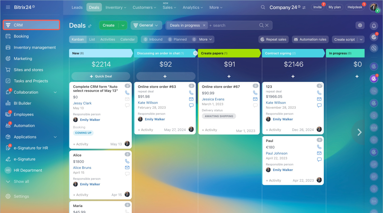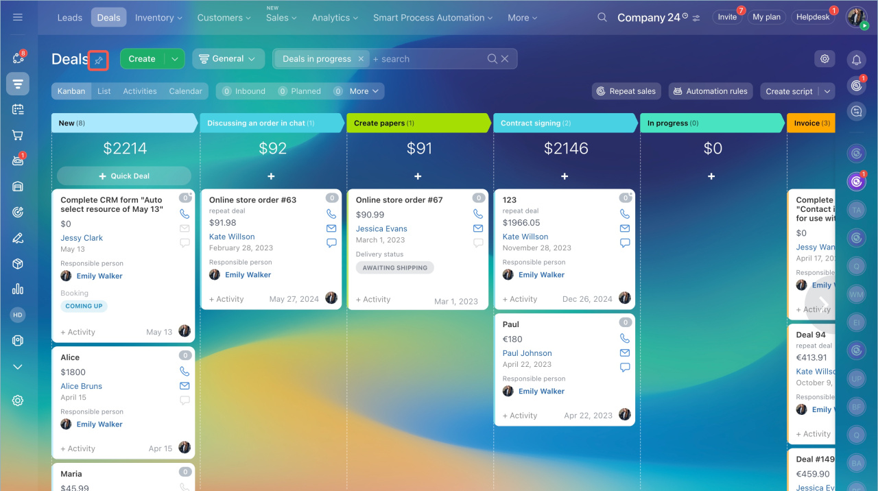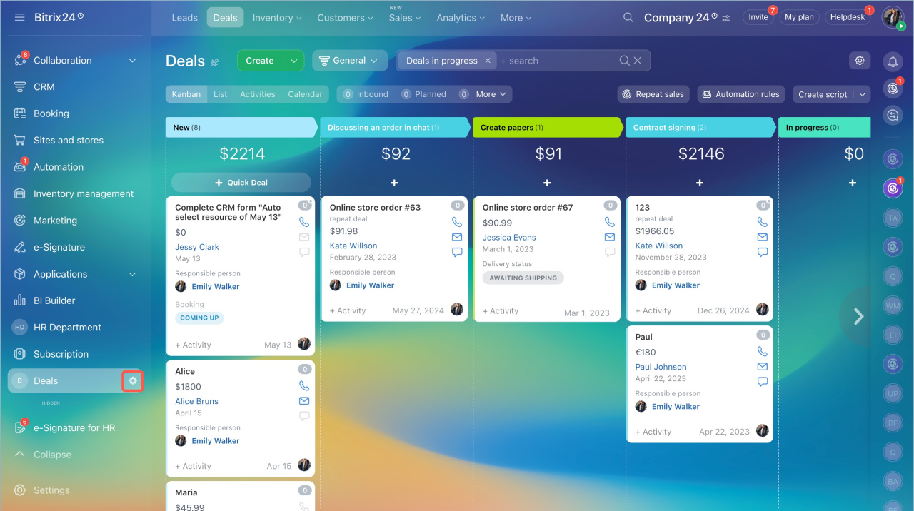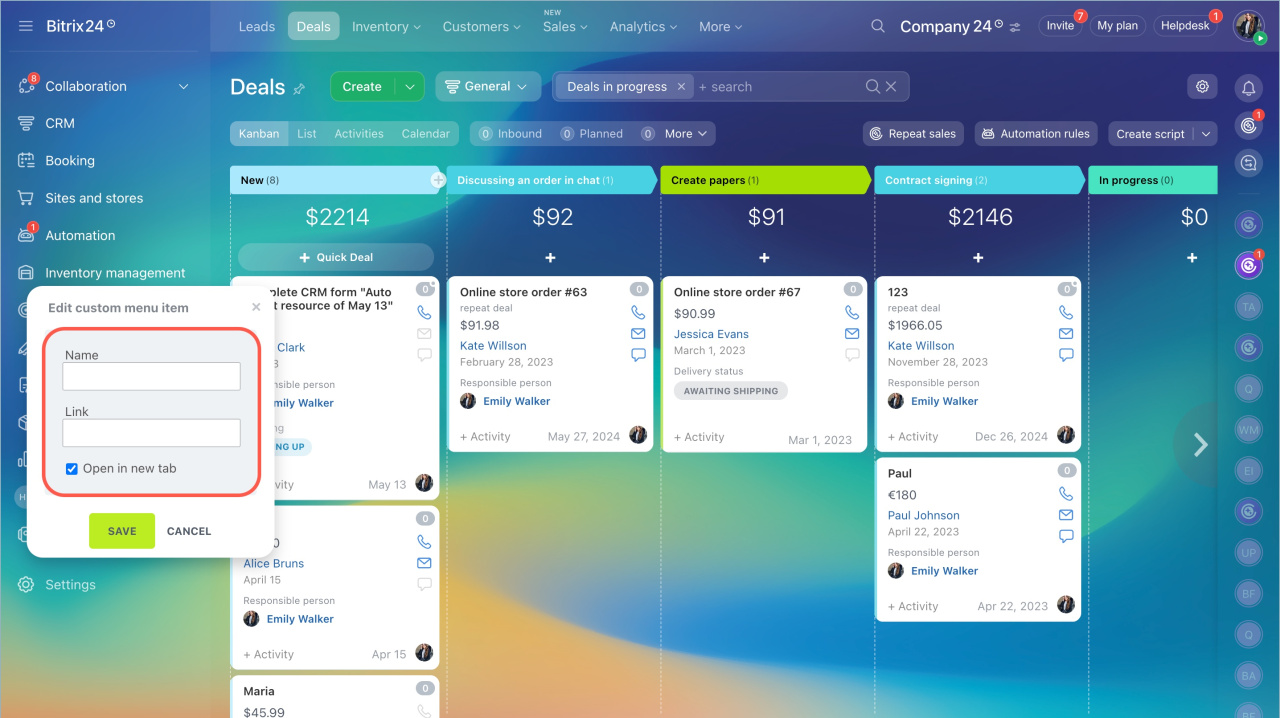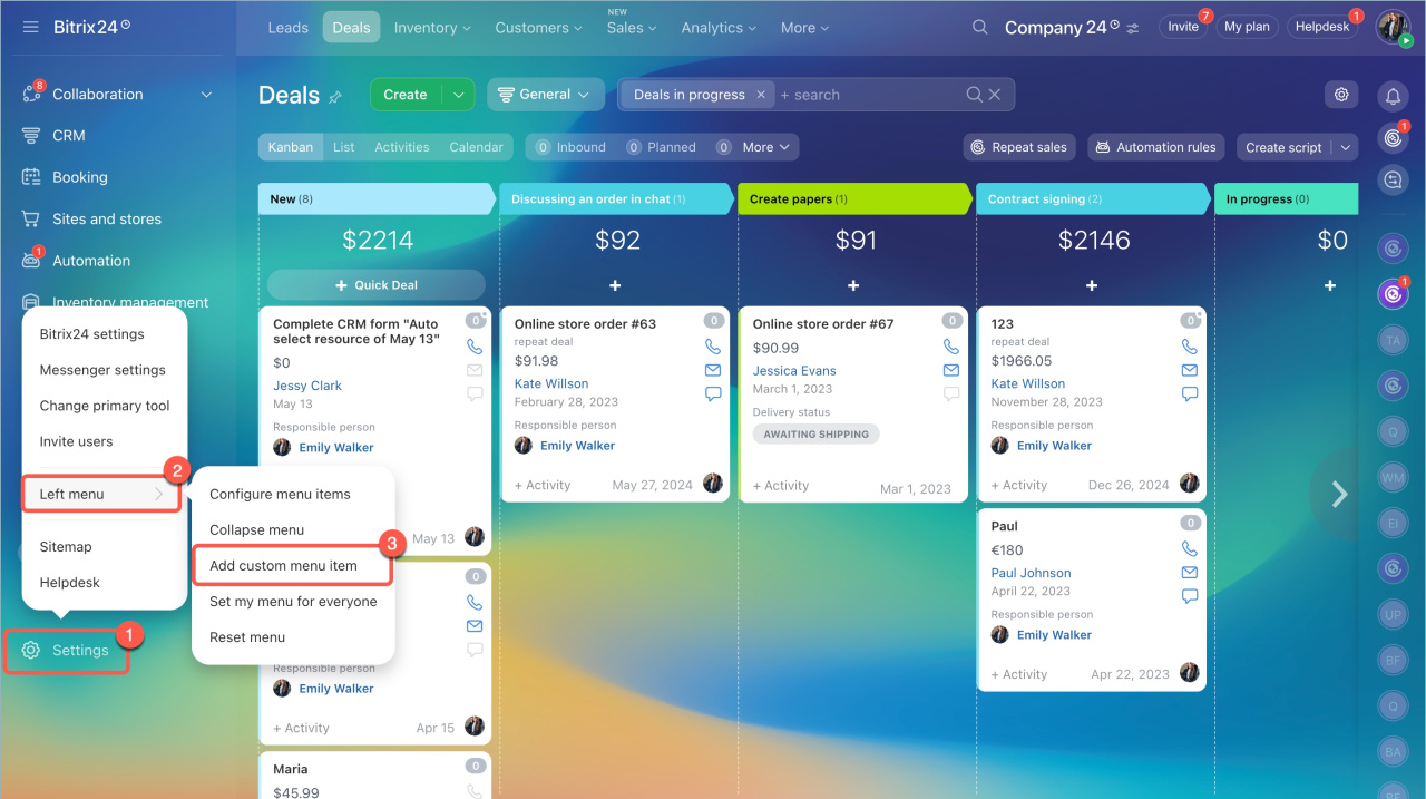 - Le menu principal de Bitrix24 peut être personnalisé : modifier le tri, ajouter de nouveaux éléments ou supprimer ceux inutiles.