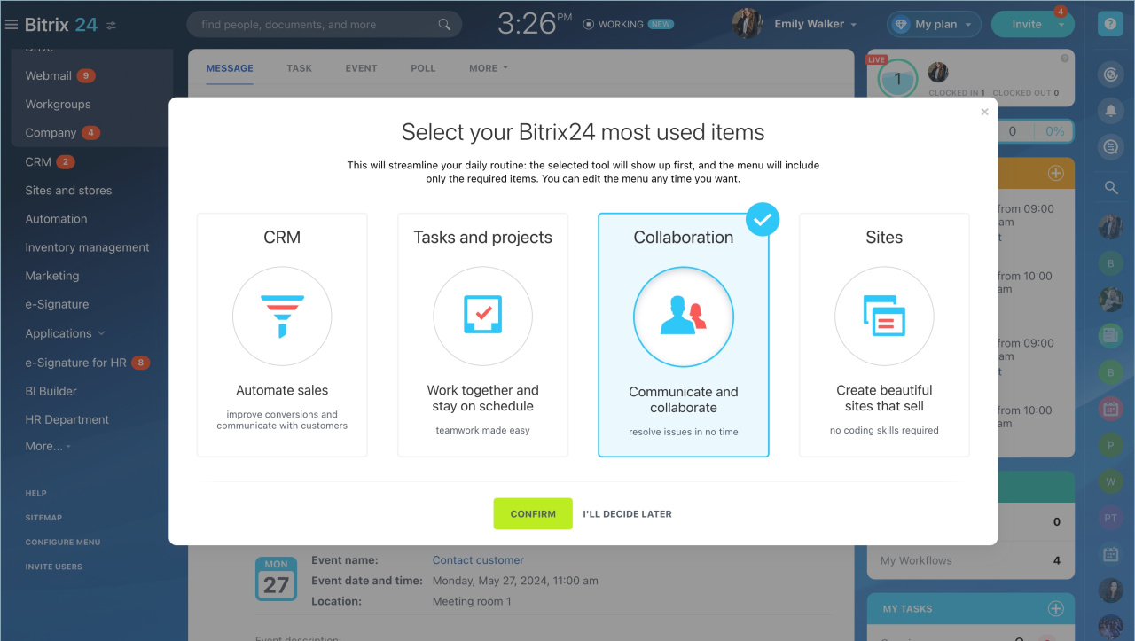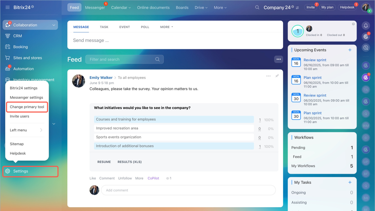 L'ordre des éléments de menu dépend de l'outil principal Bitrix24. Par défaut, la section Collaboration est sélectionnée. Pour le modifier, allez dans les paramètres du menu et sélectionnez Changer l'outil principal - Confirmer. La section sélectionnée sera située en haut.