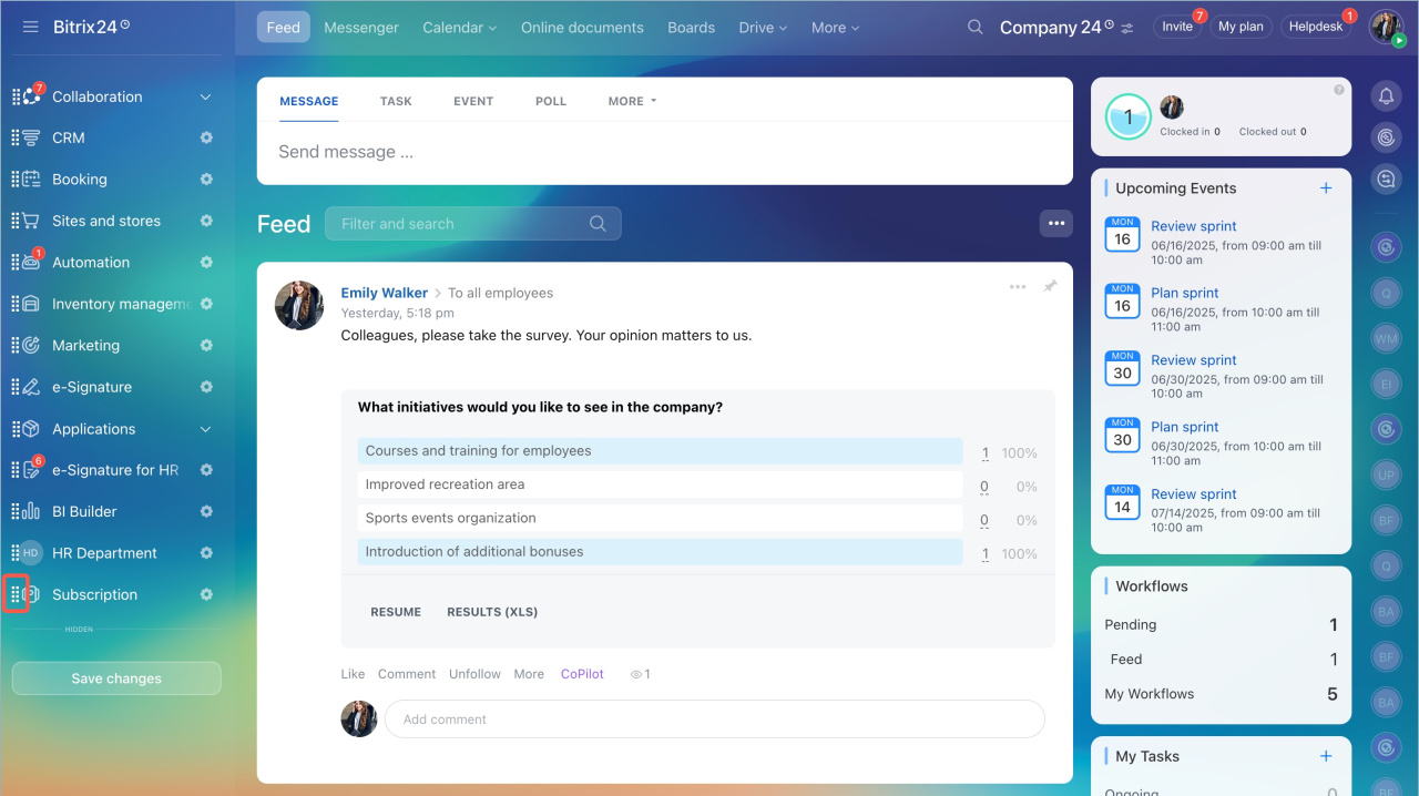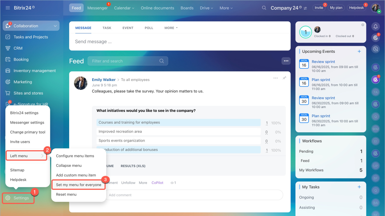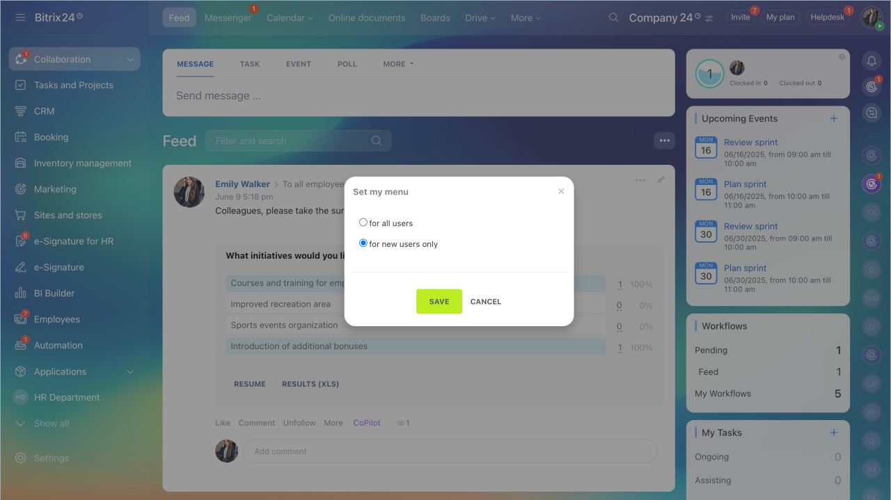 - L'administrateur Bitrix24 peut installer son propre menu pour tous les employés ou masquer dans le menu les outils qui ne sont pas utilisés dans votre entreprise.