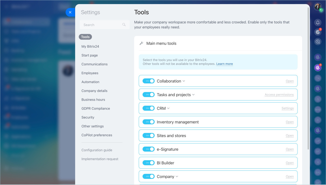 Comment afficher ou masquer des sections et des outils dans Bitrix24