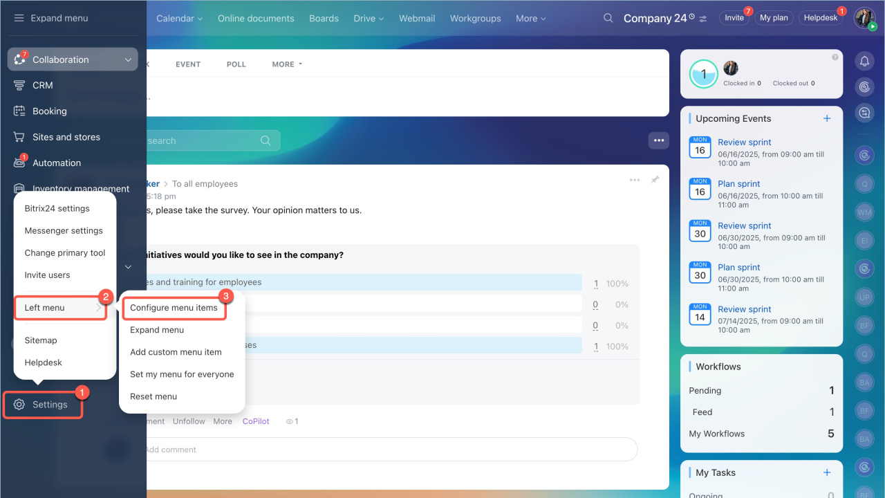 Par défaut, le menu est réduit. Pour le développer, cliquez sur Menu (≡) à côté du logo Bitrix24 ou du nom de l'entreprise. Pour accéder aux paramètres, cliquez sur Configurer le menu.