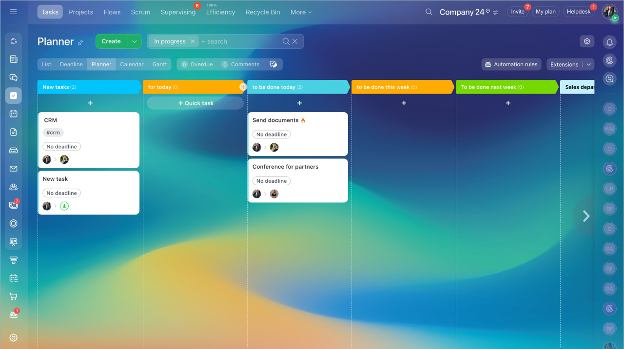 Vous pouvez organiser le travail sur des tâches et des projets dans un mode pratique : Liste, Date limite, Planificateur, Calendrier, Diagramme de Gantt - ou travailler avec des tâches en utilisant la méthode Scrum.