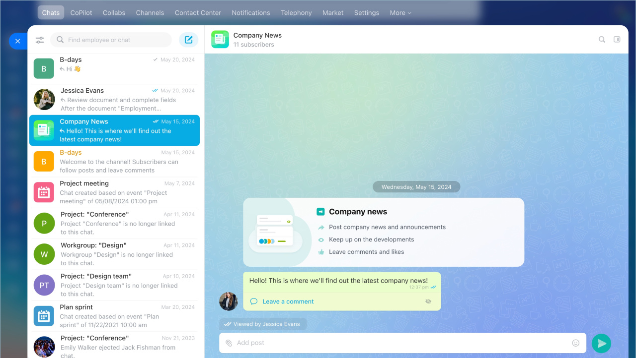 Bitrix24 Messenger est un chat, des appels vidéo et des chaînes intégrés aux processus de travail.