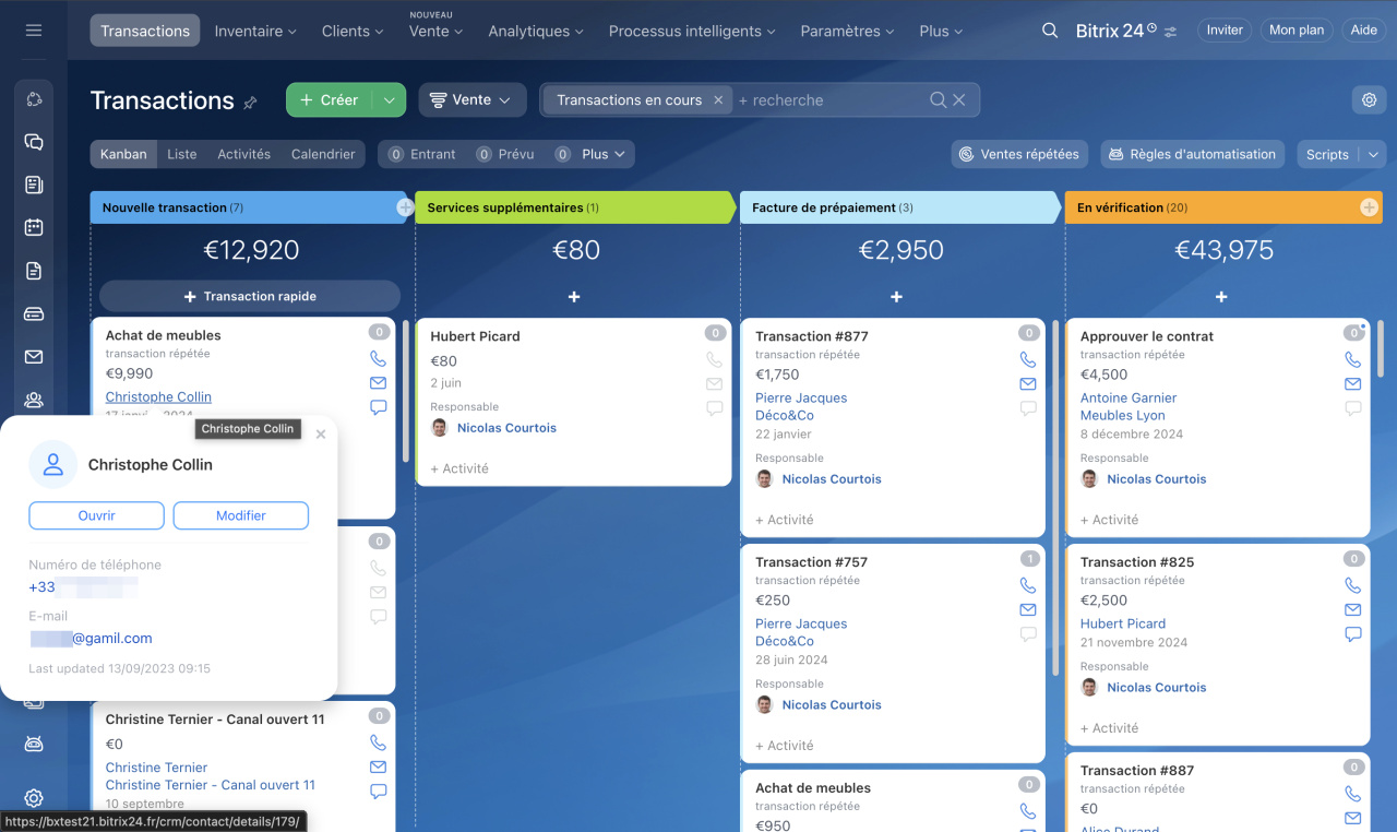 - Kanban se retrouve dans les prospects, les transactions, les factures, les devis et les processus intelligents.