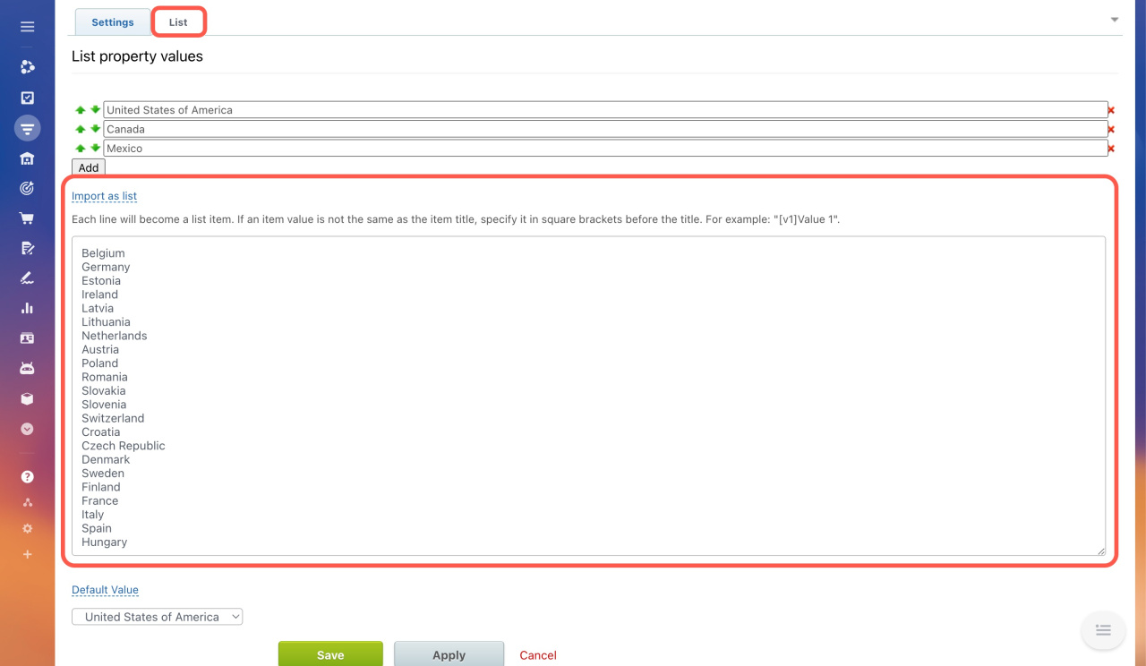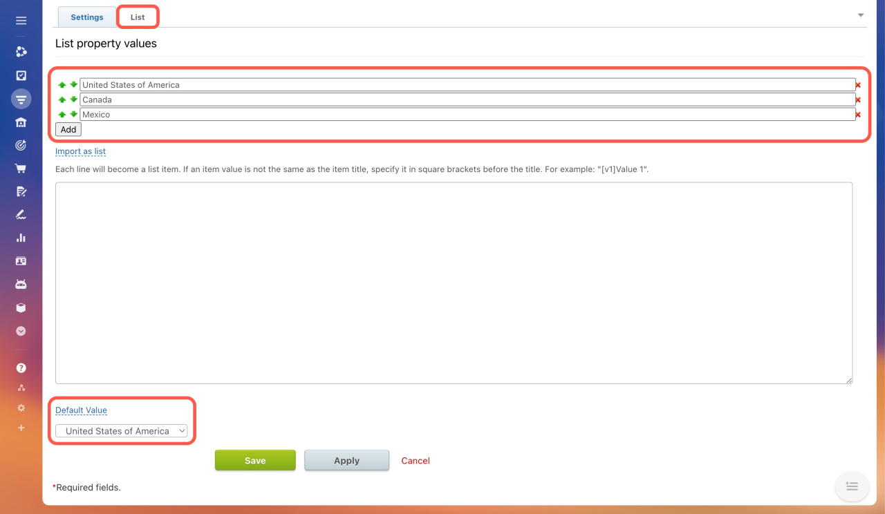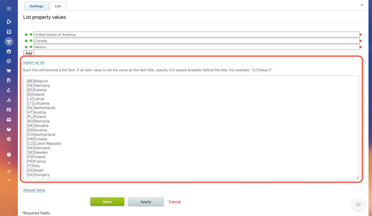 Pour échanger des données entre Bitrix24 et des systèmes externes, vous devrez peut-être spécifier une valeur de code pour chaque élément de la liste. Par exemple, [FR]France, où France est le titre de l'élément dans Bitrix24, et [FR] est le code pour l'échange système.
