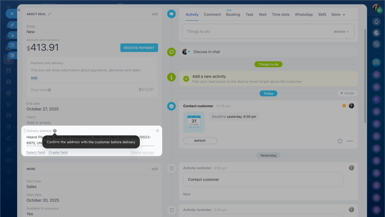 Utilisez les champs personnalisés pour stocker des informations supplémentaires sur les clients lorsque les champs standards ne suffisent pas. Créez et personnalisez ces champs en fonction des besoins de votre entreprise. Par exemple, si votre entreprise effectue des livraisons, vous pouvez créer des champs pour l'adresse de livraison, l'heure et le numéro de commande.
