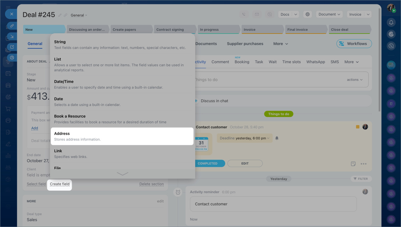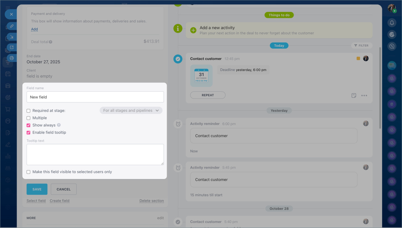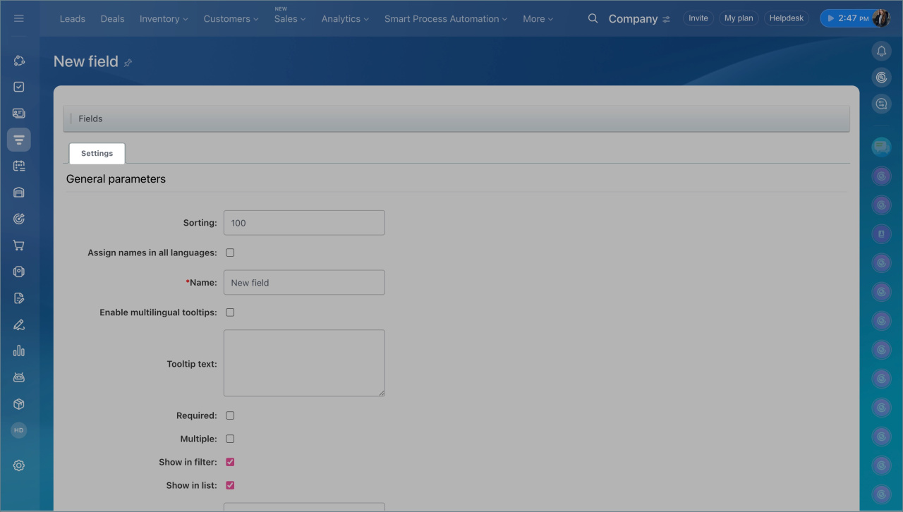 Créer un champ dans les paramètres du CRM. Cette méthode convient aux champs nécessitant des paramètres supplémentaires, tels que des listes avec de nombreuses valeurs ou des liaisons à différentes entités CRM.