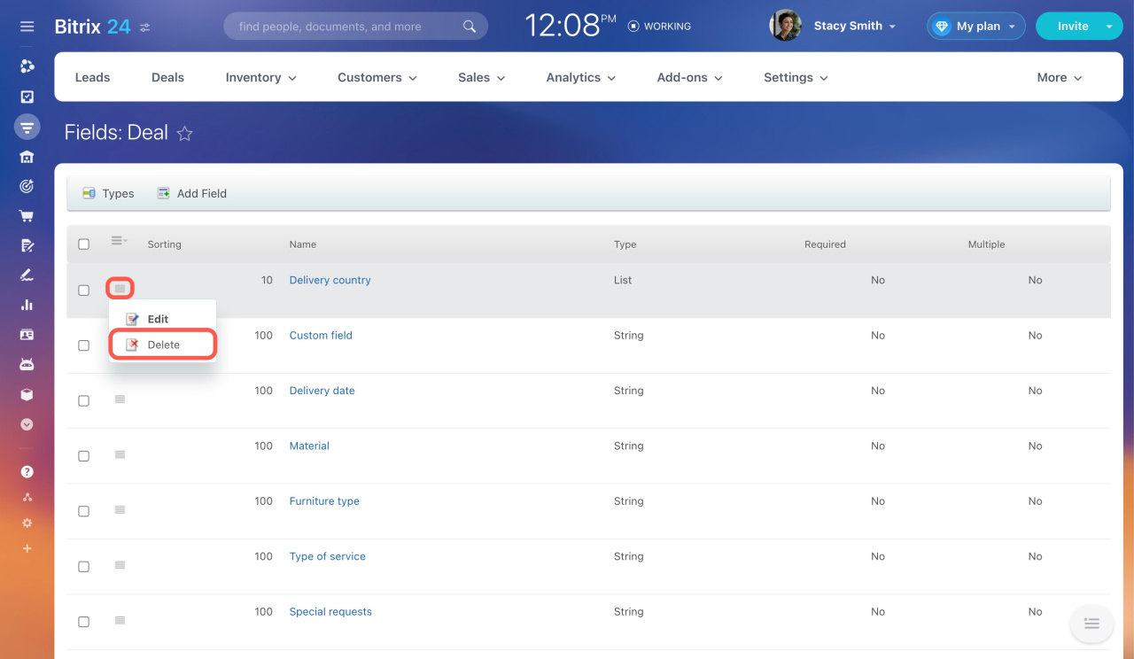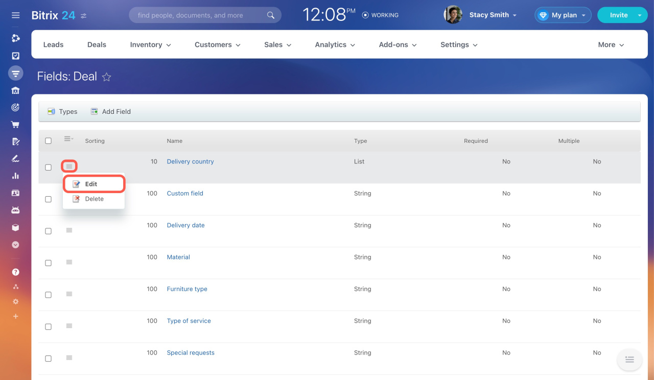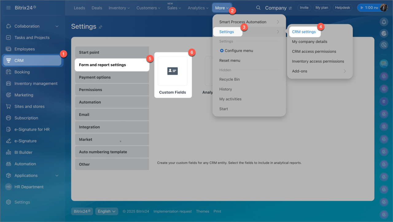 - Seuls les administrateurs Bitrix24 et les employés disposant des droits nécessaires pour modifier les paramètres CRM peuvent créer des champs personnalisés.