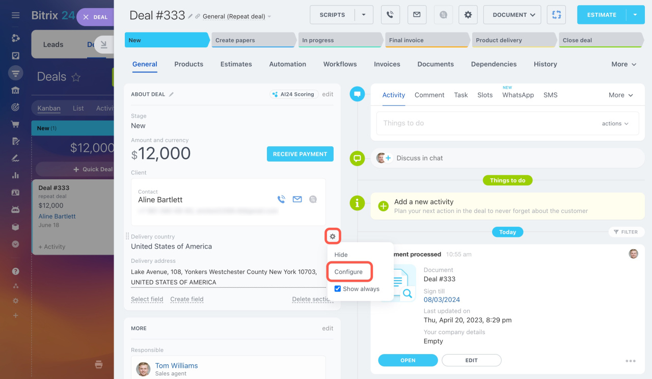 Vous pouvez modifier les paramètres d'un champ dans le formulaire d'entité ou dans les paramètres du CRM. La suppression des champs personnalisés est uniquement possible dans les paramètres du CRM.