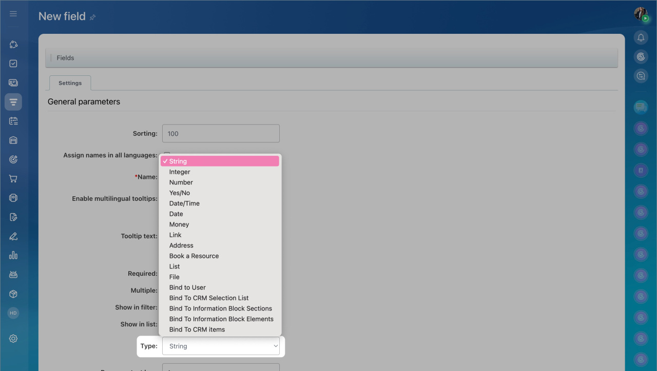 Il existe plusieurs types de champs personnalisés dans le CRM. Ils permettent de stocker différents types de données. Vous pouvez choisir le type lors de la création d'un champ.