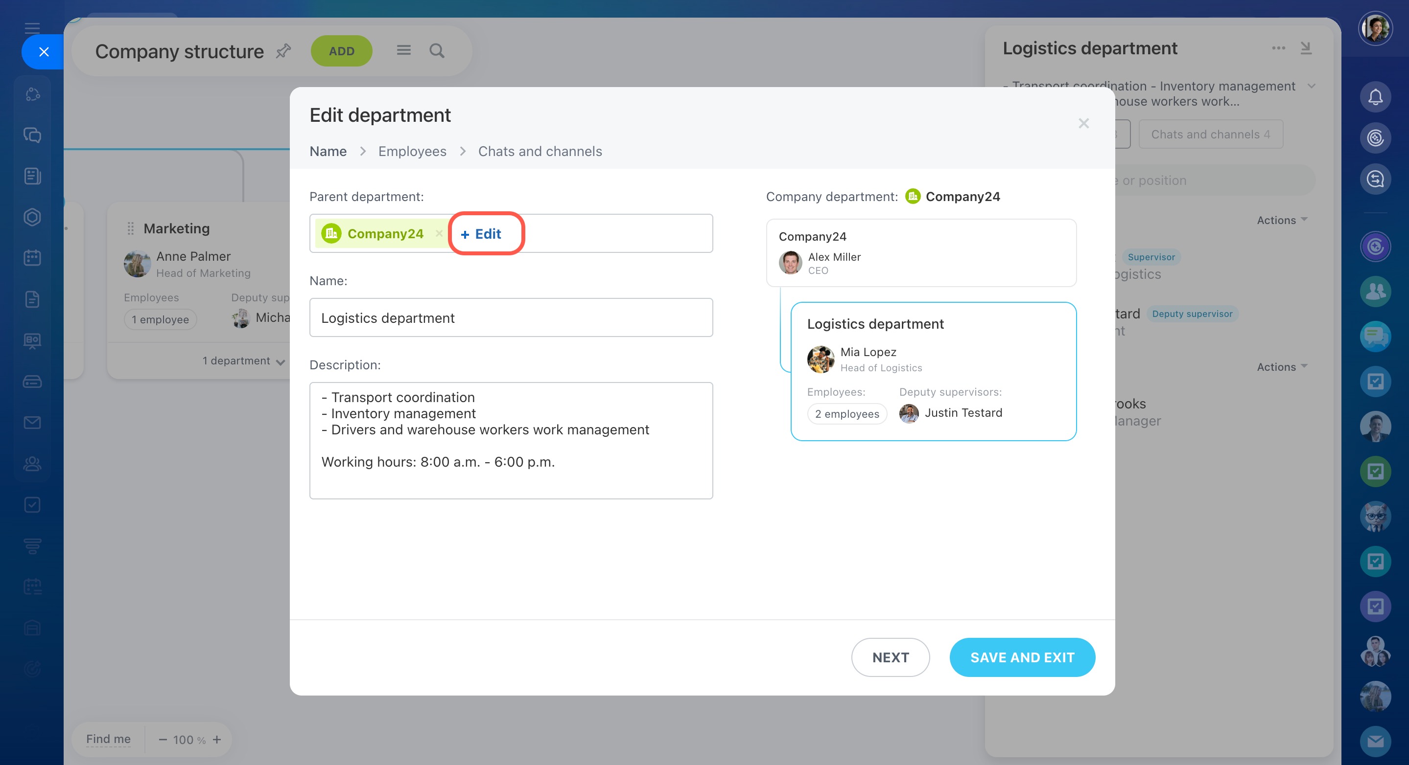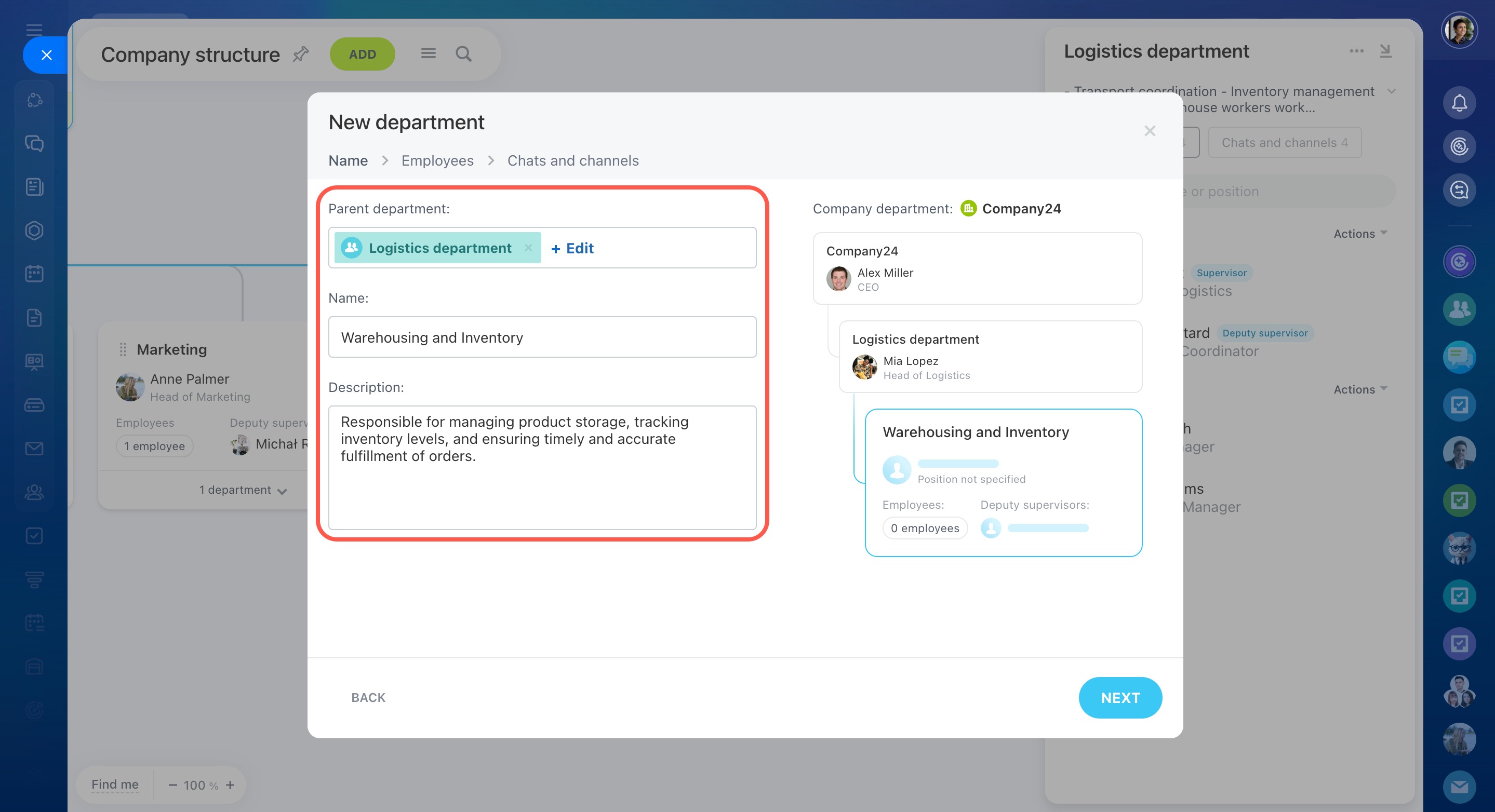 Sur le côté droit de la fenêtre des paramètres, vous pouvez voir comment le département sera affiché dans la structure de l'entreprise.