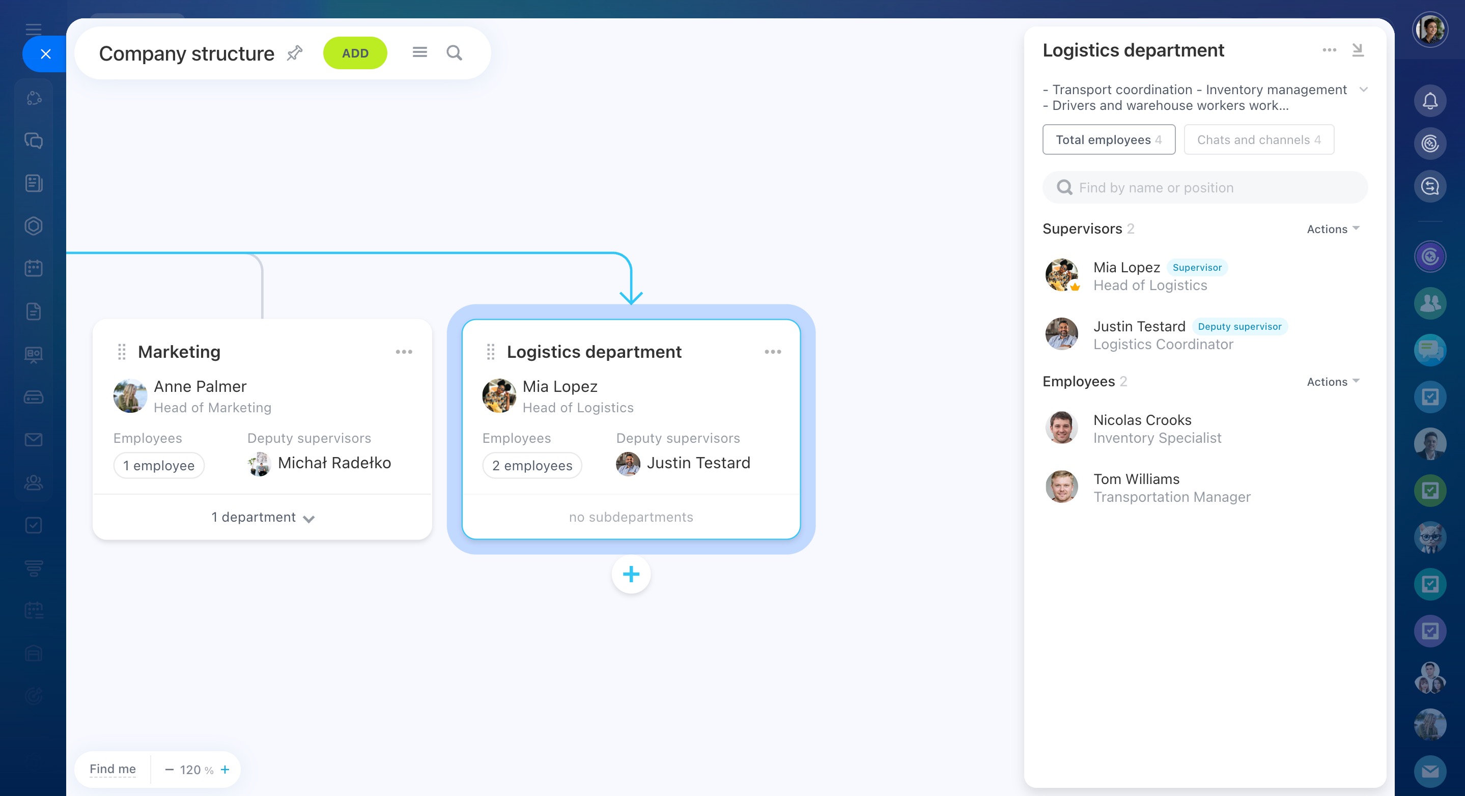 Lors de la création d'un département dans la structure de l'entreprise, vous pouvez immédiatement ajouter ses collaborateurs aux collabs, discussions et chaînes concernées.