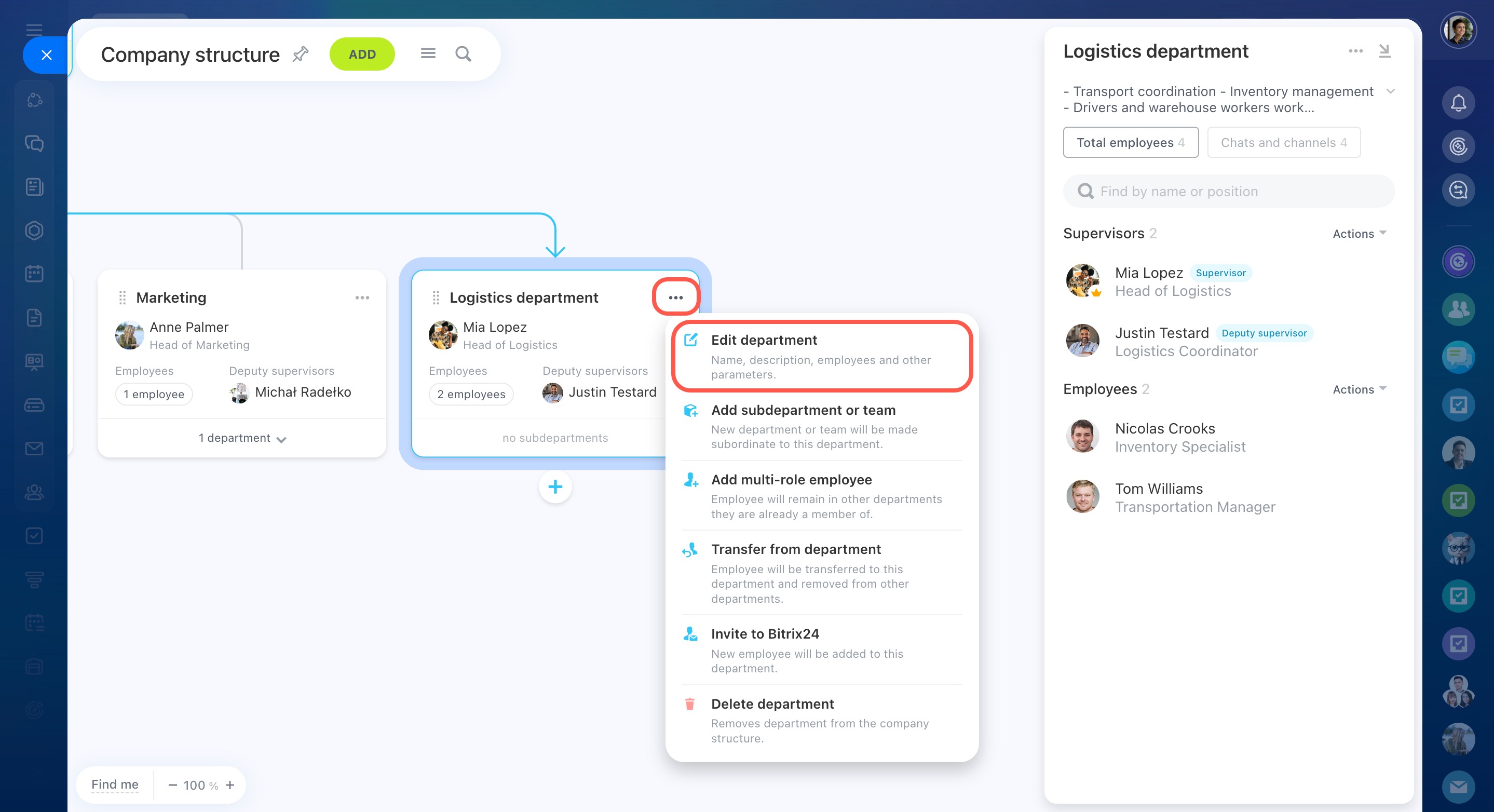 - Les départements peuvent être modifiés : vous pouvez les déplacer dans la structure, modifier le nom et la description et ajouter de nouveaux employés. Si un département n'est plus nécessaire, supprimez-le de la structure.