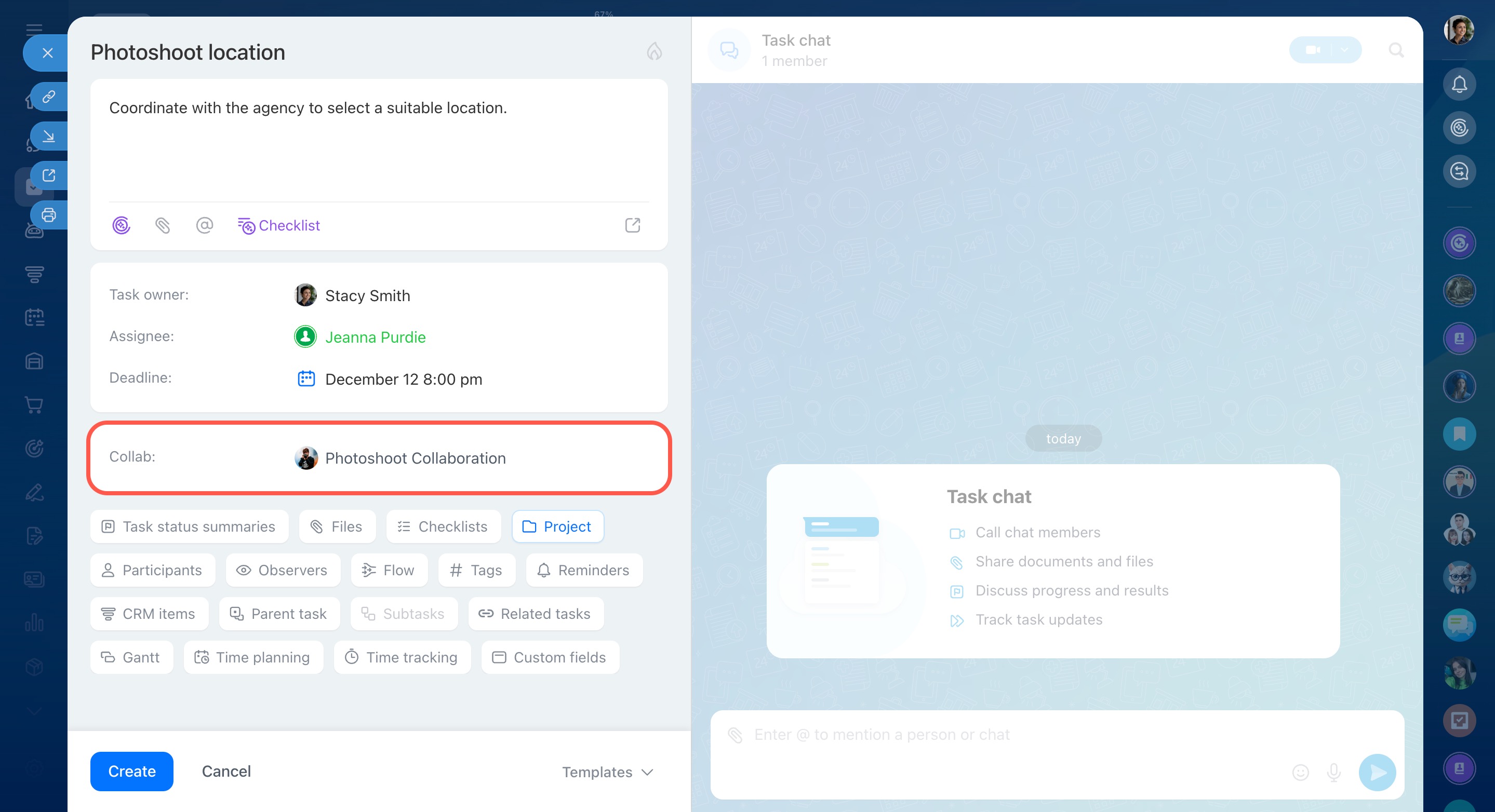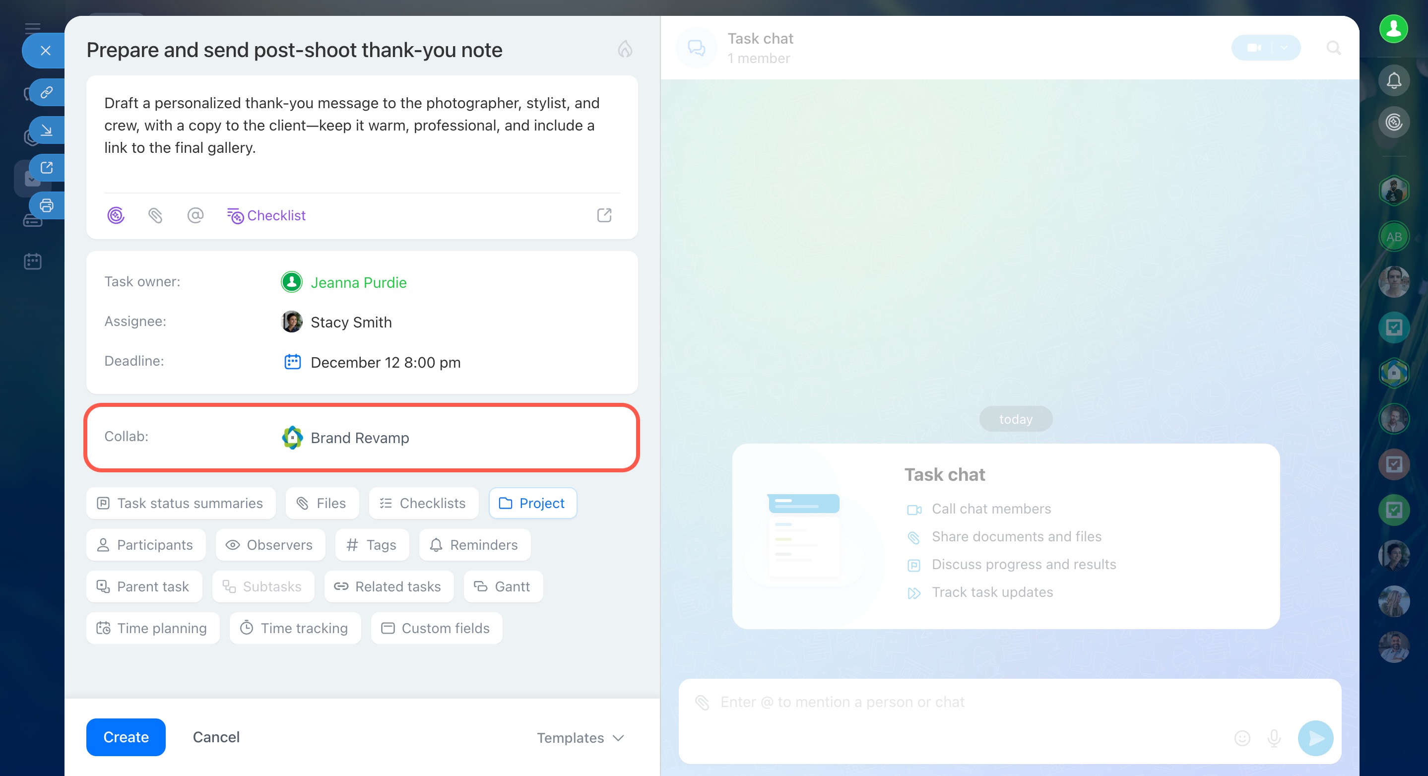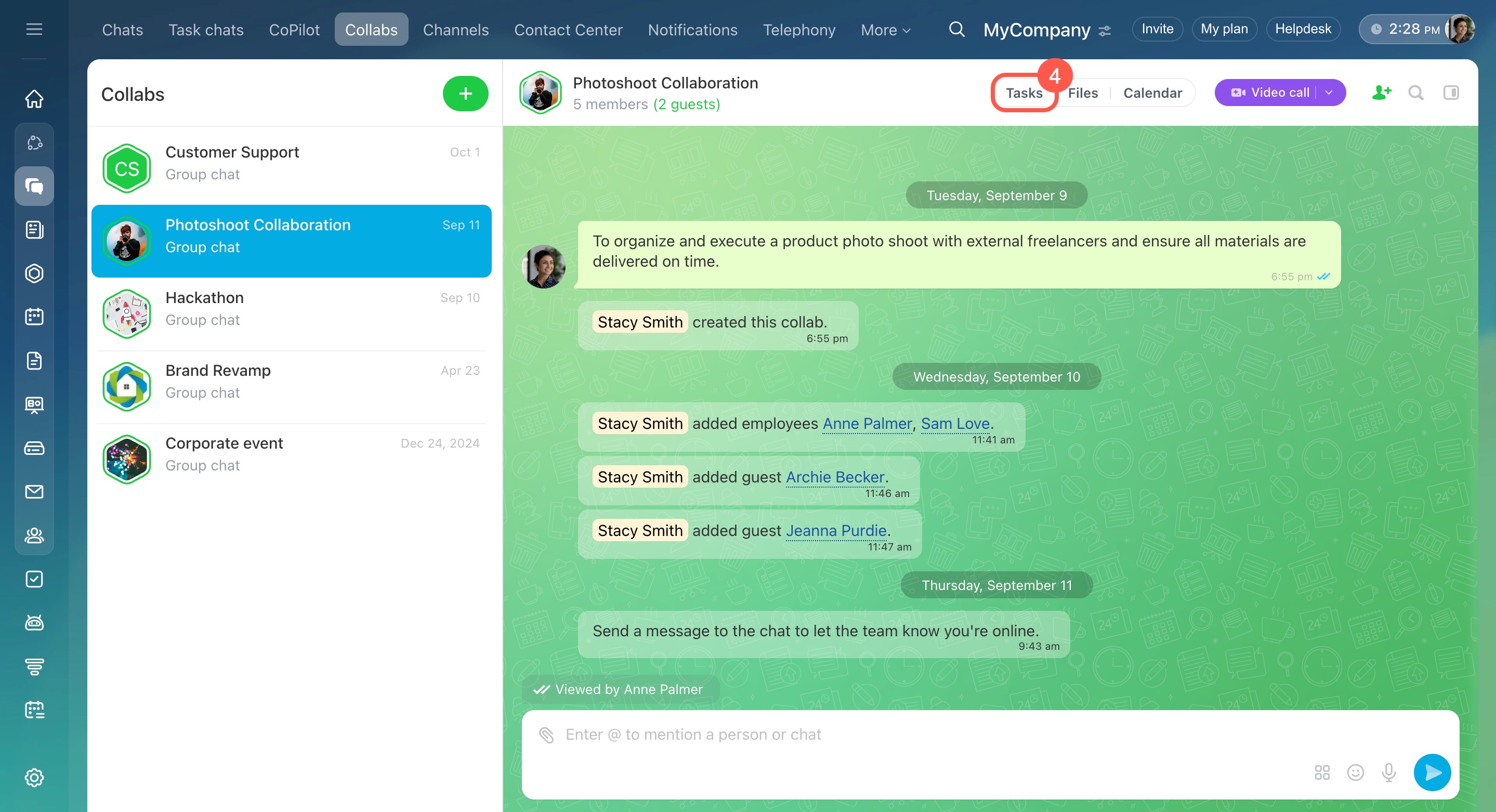 Une collab est un espace de collaboration avec des clients et des équipes externes. Discutez dans le chat, invitez des participants à des événements, travaillez avec des fichiers et attribuez des tâches. Les tâches dans les collabs aident à passer rapidement des accords aux actions concrètes. Les participants verront toutes les tâches de la collab, même s'ils n'y participent pas.